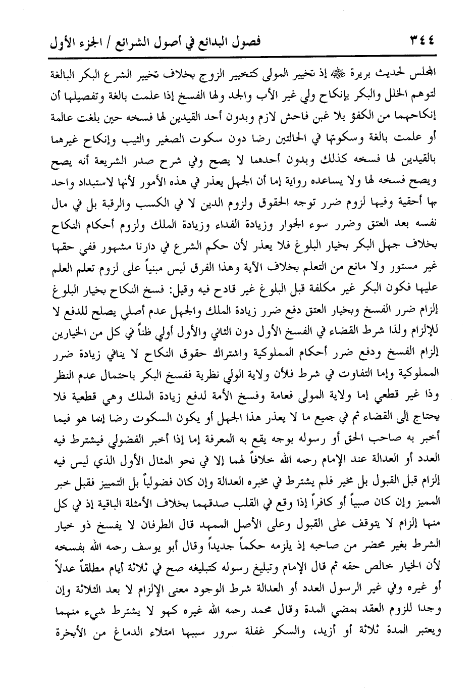 المجلس لحديث بريرة - رضي الله عنه - إذ تخيير المولى كتخيير الزوج بخلاف تخيير الشرع البكر البالغة لتوهم الخلل والبكر بإنكاح ولي غير الأب والجد ولها الفسخ إذا علمت بالغة وتفصيلها أن إنكاحهما من الكفؤ بلا غبن فاحش لازم وبدون أحد القيدين لها فسخه حين بلغت عالمة أو علمت بالغة وسكوتها في الحالتين رضا دون سكوت الصغير والثيب وإنكاح غيرهما بالقيدين لها فسخه كذلك وبدون أحدهما لا يصح وفي شرح صدر الشريعة أنه يصح ويصح فسخه لها ولا يساعده رواية إما أن الجهل يعذر في هذه الأمور لأنها لاستبداد واحد بها أحقية وفيها لزوم ضرر توجه الحقوق ولزوم الدين لا في الكسب والرقبة بل في مال نفسه بعد العتق وضرر سوء الجوار وزيادة الفداء وزيادة الملك ولزوم أحكام النكاح بخلاف جهل البكر بخيار البلوغ فلا يعذر لأن حكم الشرع في دارنا مشهور ففي حقها غير مستور ولا مانع من التعلم بخلاف الآية وهذا الفرق ليس مبنيًا على لزوم تعلم العلم عليها فكون البكر غير مكلفة قبل البلوغ غير قادح فيه وقيل: فسخ النكاح بخيار البلوغ إلزام ضرر الفسخ وبخيار العتق دفع ضرر زيادة الملك والجهل عدم أصلى يصلح للدفع لا للإلزام ولذا شرط القضاء في الفسخ الأول دون الثاني والأول أولى ظنًا في كل من الخيارين إلزام الفسخ ودفع ضرر أحكام المملوكية واشتراك حقوق النكاح لا ينافي زيادة ضرر المملوكية وإما التفاوت في شرط فلأن ولاية الولى نظرية ففسخ البكر باحتمال عدم النظر وذا غير قطعي إما ولاية المولى فعامة وفسخ الأمة لدفع زيادة الملك وهي قطعية فلا يحتاج إلى القضاء ثم في جميع ما لا يعذر هذا الجهل أو يكون السكوت رضا إنما هو فيما أخبر به صاحب الحق أو رسوله بوجه يقع به المعرفة إما إذا أخبر الفضولي فيشترط فيه العدد أو العدالة عند الإمام رحمه الله خلافًا لهما إلا في نحو المثال الأول الذي ليس فيه إلزام قبل القبول بل مخير فلم يشترط في مخبره العدالة وإن كان فضوليًا بل التمييز فقبل خبر المميز وإن لكان صبيًا أو كافرًا إذا وقع في القلب صدقهما بخلاف الأمثلة الباقية إذ في كل منها إلزام لا يتوقف على القبول وعلى الأصل الممهد قال الطرفان لا يفسخ ذو خيار الشرط بغير محضر من صاحبه إذ يلزمه حكمًا جديدًا وقال أبو يوسف رحمه الله بفسخه لأن الخيار خالص حقه ثم قال الإمام وتبليغ رسوله كتبليغه صح في ثلاثة أيام مطلقًا عدلًا أو غيره وفي غير الرسول العدد أو العدالة شرط الوجود معنى الإلزام لا بعد الثلاثة وإن وجدا للزوم العقد بمضي المدة وقال محمد رحمه الله غيره كهو لا يشترط شيء منهما ويعتبر المدة ثلاثة أو أزيد، والسكر غفلة سرور سببها امتلاء الدماغ من الأبخرة