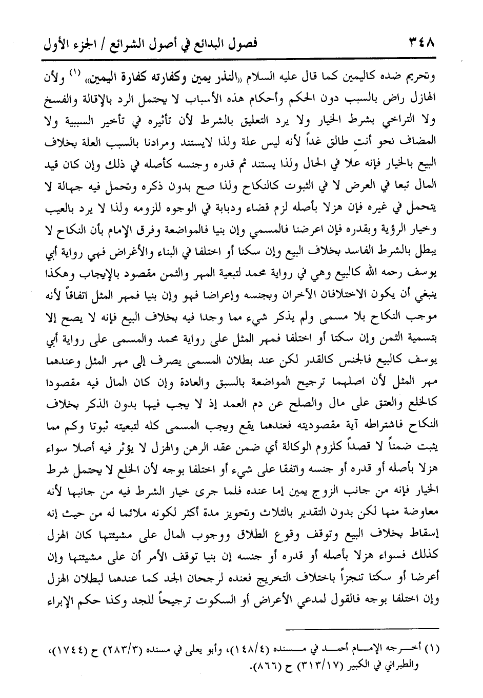 وتحريم ضده كاليمين كما قال عليه السلام "النذر يمين وكفارته كفارة اليمين" (¬1) ولأن الهازل راض بالسبب دون الحكم وأحكام هذه الأسباب لا يحتمل الرد بالإقالة والفسخ ولا التراخي بشرط الخيار ولا يرد التعليق بالشرط لأن تأثيره في تأخير السببية ولا المضاف نحو أنتِ طالق غدًا لأنه ليس علة ولذا لا يستند ومرادنا بالسبب العلة بخلاف البيع بالخيار فإنه علا في الحال ولذا يستند ثم قدره وجنسه كأصله في ذلك وإن كان قيد المال تبعًا في العرض لا في الثبوت كالنكاح ولذا صح بدون ذكره وتحمل فيه جهالة لا يتحمل في غيره فإن هزلا بأصله لزم قضاء ودبابة في الوجوه للزومه ولذا لا يرد بالعيب وخيار الرؤية وبقدره فإن اعرضنا فالمسمي وإن بنيا فالمواضعة وفرق الإِمام بأن النكاح لا يبطل بالشرط الفاسد بخلاف البيع وإن سكنا أو اختلفا في البناء والأغراض فهي رواية أبي يوسف رحمه الله كالبيع وهي في رواية محمَّد لتبعية المهر والثمن مقصود بالإيجاب وهكذا ينبغي أن يكون الاختلافان الآخران وبجنسه وإعراضا فهو وإن بنت فمهر المثل اتفاقًا لأنه موجب النكاح بلا مسمى ولم يذكر شيء مما وجدا فيه بخلاف البيع فإنه لا يصح إلا بتسمية الثمن وإن سكتا أو اختلفا فمهر المثل على رواية محمَّد والمسمى على رواية أبي يوسف كالبيع فالجنس كالقدر لكن عند بطلان المسمى يصرف إلى مهر المثل وعندهما مهر المثل لأن أصلهما ترجيح المواضعة بالسبق والعادة وإن كان المال فيه مقصودا كالخلع والعتق على مال والصلح عن دم العمد إذ لا يجب فيها بدون الذكر بخلاف النكاح فاشتراطه آية مقصوديته فعندهما يقع ويجب المسمى كله لتبعيته ثبوتا وكم مما يثبت ضمنًا لا قصدًا كلزوم الوكالة أي ضمن عقد الرهن والهزل لا يؤثر فيه أصلًا سواء هزلا بأصله أو قدره أو جنسه واتفقا على شيء أو اختلفا بوجه لأن الخلع لا يحتمل شرط الخيار فإنه من جانب الزوج يمين إما عنده فلما جرى خيار الشرط فيه من جانبها لأنه معاوضة منها لكن بدون التقدير بالثلاث وتحويز مدة أكثر لكونه ملائما له من حيث إنه إسقاط بخلاف البيع وتوقف وقوع الطلاق ووجوب المال على مشيئتها كان الهزل كذلك فسواء هزلا بأصله أو قدره أو جنسه إن بنيا توقف الأمران على مشيئتها وإن أعرضا أو سكتا تنجزًا باختلاف التخريج فعنده لرجحان الجد كما عندهما لبطلان الهزل وإن اختلفا بوجه فالقول لمدعي الأعراض أو السكوت ترجيحًا للجد وكذا حكم الإبراء