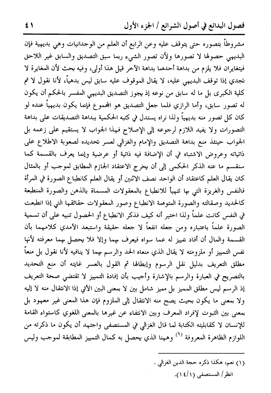 مشروطًا بتصوره حتى يتوقف عليه وعن الرابع أن العلم من الوجدانيات وهي بديهية فإن البديهي حصولها لا تصورها ولأن تصور الشيء ربما سبق التصديق والسابق غير اللاحق فيتغايران فلا يلزم من بداهة أحدهما بداهة الآخر قيل هذا أولى، وفيه بحث لأن المغايرة لا تجدي إذا توقف البديهي عليه، لا يقال الموقوف عليه سابق ليس بدهيًا، لأنا نقول لا تم كلية الكبرى بل ما له سابق من نوعه إذ يجوز التصديق البديهي المفسر بالحكم أن يكون له تصور سابق، وأما الرازي فلما جعل التصديق هو المجموع فإنما يكون بديهيًا عنده لو كان كل تصور منه بديهيًا ولذا نراه يستدل في كتبه الحكمية ببداهة التصديقات على بداهة التصورات ولا يفيد اللازم لرجوعه إلى الإصلاح فهذا الجواب لا يستقيم على زعمه بل الجواب حينئذ منع بداهة التصديق والإمام والغزالي لعسر تحديده لصعوبة الاطلاع على ذاتياته وعروض الاشتباه في أن الإضافة فيه ذاتية أو عرضية وإنما يعرف بالقسمة كما سنقسم ما عنه الذكر الحكمي إلى أن يخرج الاعتقاد الجازم المطابق لموجب أو بالمثال كان يقال العلم كاعتقاد أن الواحد نصف الاثنين أو يقال العلم كانطباع الصورة في المرأة فالنفس والغريزة التي بها تتهيأ للانطباع بالمعقولات المسماة بالذهن والصورة المنطبعة كالحديد وصقالته والصورة المتوهمة الانطباع وصور المعقولات حقائقها التي إذا انطبعت في النفس كانت علمًا ولذا اختير أنه كيف فذكر الانطباع أو الحصول تنبيه على أن تسمية الصورة علمًا باعتباره ومن جعله انفعًا لا جعله حقيقة واستبعد الآمدي كلامهما بأن القسمة والمال أن أفاد تمييز له عما سواه فيعرف بهما وإلا فلا يحصل بهما معرفته لأنها نفس التمييز أو ملزومته لا يقال الذي منعاه الحد والرسم بهما لا ينافيه لأنا نقول بل منعًا مطلق التعريف بدليل نقل الرسوم وإبطالها ثم القول بالعسر غايته أن منع التحديد بالتصريح في العبارة والرسم بالإشارة وأجيب بأن إفادة التمييز لا تقتضي صحة التعريف إذ الرسم ليس مطلق المميز بل مميز شامل بين لا بمعنى البين الآتي إذا الانتقال منه لا إليه ولا بمعنى ما يكون بحيث يصح منه الانتقال إلى الملزوم فإن هذا المعنى غير معهود بل بمعنى بين الثبوت لإفراد المعرف وبين الانتفاء عن غيرها بالمعنى اللغوي كاستواء القامة للإنسان لا كقابليته الكتابة لما قال الغزالي في المستصفى واجتهد أن يكون ما ذكرته من اللوازم الظاهرة المعروفة (¬1) وههنا الذي يحصل به كمال التمييز المطابقة لموجب وليس