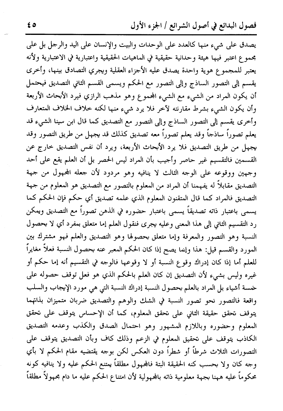 يصدق على شيء منها كالعدد على الوحدات والبيت والإنسان على اليد والرجل بل على مجموع اعتبر فيها هيئة وحدانية حقيقية في الماهيات الحقيقية واعتبارية في الاعتبارية ولأنه يعتبر للمجموع هوية واحدة يصدق عليه الأجزاء العقلية ويجري التصادق بينها، وأخرى يقسم إلى التصور الساذج وإلى التصور مع الحكم ويسمى القسم الثاني التصديق فيحتمل أن يكون المراد من الشيء مع الشيء المجموع وهو مذهب الرازي فيرد الأبحاث الأربعة وأن يكون الشيء بشرط مقارنته لآخر فلا يرد شيء منها لكنه خلاف الخلاف المتعارف وأخرى يقسم إلى التصور الساذج وإلى التصور مع التصديق كما قال ابن سينا الشيء قد يعلم تصورًا ساذجًا وقد يعلم تصورًا معه تصديق كذلك قد يجهل من طريق التصور وقد يجهل من طريق التصديق فلا يرد الأبحاث الأربعة، ويرد أن نفس التصديق خارج عن القسمين فالتقسيم غير حاصر وأجيب بأن المراد ليس الحصر بل أن العلم يقع على أحد وجهين ووقوعه على الوجه الثالث لا ينافيه وهو مردود لأن جعله المجهول من جهة التصديق مقابلًا له يفهمنا أن المراد من المعلوم بالتصور مع التصديق هو المعلوم من جهة التصديق فالمراد كما قال المتقنون المعلوم الذي علمه تصديق أي حكم فإن الحكم كما يسمى باعتبار ذاته تصديقًا يسمى باعتبار حضوره في الذهن تصورًا مع التصديق ويمكن رد التقسيم الثاني إلى هذا المعنى وعليه يجرى فنقول العلم إما متعلق بمفرد أي لا بحصول النسبة وهو التصور والمعرفة وإما متعلق بحصولها وهو التصديق والعلم فهو مشترك بين المورد والقسم قيل: هذا وإنما يصح إذا كان الحكم المعبر عنه بحصول النسبة فعلًا مغايرًا للعلم أما إذا كان إدراك وقوع النسبة أو لا وقوعها فالوجه في التقسيم أنه إما حكم أو غيره وليس بشيء لأن التصديق إن كان العلم بالحكم الذي هو فعل توقف حصوله على خمسة أشياء بل المراد بالعلم بحصول النسبة إدراك النسبة التي هي مورد الإيجاب والسلب واقعة فالتصور نحو تصور النسبة في الشك والوهم والتصديق ضربان متميزان بذاتهما يتوقفك تحقق حقيقة الثاني على تحقق المعلوم، كما أن الإحساس يتوقف على تحقق المعلوم وحضوره وباللازم المشهور وهو احتمال الصدق والكذب وعدمه التصديق الكاذب يتوقف على تحقيق المعلوم في الزعم وذلك كاف وبأن التصديق يتوقف على التصورات الثلاث شرطًا أو شطرًا دون العكس لكن بوجه يقتضيه مقام الحكم لا بأي وجه كان ولا بحسب كنه الحقيقة البتة فالمجهول مطلقًا يمتنع الحكم عليه ولا ينافيه كونه محكومًا عليه ها هنا بجهة معلومية ذاته بالمجهولية لأن امتناع الحكم عليه ما دام مجهولًا مطلقًا