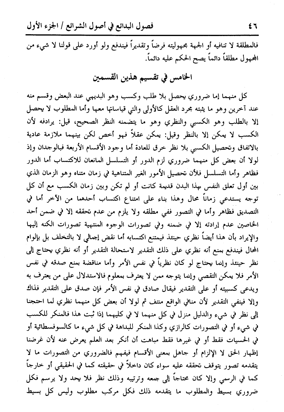 كل منهما إما ضروري يحصل بلا طلب وكسب وهو البديهي عند البعض وقسم منه عند آخرين وهو ما يثبته مجرد العقل كالأولى والتي قياساتها معها وأما المطلوب لا يحصل إلا بالطلب وهو الكسبي والنظري وهو ما يتضمنه النظر الصحيح، قيل: يرادفه لأن الكسب لا يمكن إلا بالنظر وقيل: يمكن عقلًا فهو أخص لكن بينهما ملازمة عادية بالاتفاق وتحصيل الكسبي بلا نظر خرق للعادة أما وجود الأقسام الأربعة فبالوجدان وإذ لولا أن بعض كل منهما ضروري لزم الدور أو التسلسل المانعان للاكتساب أما الدور فظاهر وأما التسلسل فلأن تحصيل الأمور الغير المتناهية في زمان متناه وهو الزمان الذي بين أول تعلق النفس بهذا البدن قديمة كانت أو لم تكن وبين زمان الكسب مع أن كل توجه يستدعي زمانًا محال وهذا بناء على امتناع اكتساب أحدهما من الآخر أما في التصديق فظاهر وأما في التصور ففي مطلقه ولا يلزم من عدم تحققه إلا في ضمن أحد الخاصين عدم إرادته إلا في ضمنه وفي تصورات الوجوه المنتهية تصورات الكنه إليها والإيراد بأن هذا أيضًا نظري حينئذ فيمتنع اكتسابه أما نقض إجمالي لا بالتخلف بل بإلوام المحال فيندفع بمنع أنه نظري على ذلك التقدير لاستحالة التقدير أو أنه نظري يحتاج إلى نظر حينئذ وإنما يحتاج لو كان نظريًا في نفس الأمر وأما مناقضة بمنع صدقه في نفس الأمر فلا يمكن التقصي وإنما يتوجه ممن لا يعترف بمعلوم فالاستدلال على من يعترف به ويدعى كسبيته أو على التقدير فيقال صادق في نفس الأمر فإن صدق على التقدير فذاك وإلا فينفي التقدير لأن منافي الواقع منتف ثم لولا أن بعض كل منهما نظري لما احتجنا إلى نظر في شيء والدليل منزل في كل منهما لا في كليهما إذا ثبت هذا فالمنكر للكسب في شيء أو في التصورات كالرازي وكذا المنكر للبداهة في كل شيء ما كالسوفسطائية أو في الحسيات فقط أو في غيرها فقط مباهت أن أنكر بعد العلم يعرض عنه لأن غرضنا إظهار الحق لا الإلزام أو جاهل بمعنى الأقسام فيفهم فالضروري من التصورات ما لا يتقدمه تصور يتوقف تحققه عليه سواء كان داخلًا في حقيقته كما في الحقيقي أو خارجًا كما في الرسمي وإلا كان محتاجًا إلى جمعه وترتيبه وذلك نظر فلا يحد ولا يرسم فكل ضروري بسيط والمطلوب ما يتقدمه ذلك فكل مركب مطلوب وليس كل بسيط