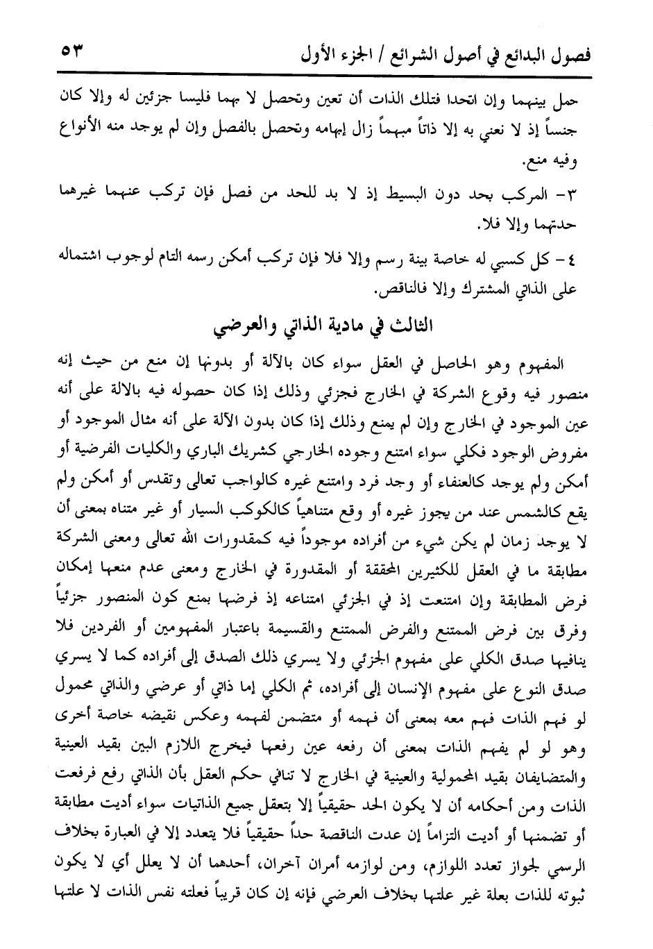 المفهوم وهو الحاصل في العقل سواء كان بالآلة أو بدونها إن منع من حيث إنه منصور فيه وقوع الشركة في الخارج فجزئي وذلك إذا كان حصوله فيه بالآلة على أنه عين الموجود في الخارج وإن لم يمنع وذلك إذا كان بدون الآلة على أنه مثال الموجود أو مفروض الوجود فكلي سواء امتنع وجوده الخارجي كشريك الباري والكليات الفرضية أو أمكن ولم يوجد كالعنفاء أو وجد فرد وامتنع غيره كالواجب تعالى وتقدس أو أمكن ولم يقع كالشمس عند من يجوز غيره أو وقع متناهيًا كالكوكب السيار أو غير متناه بمعنى أن لا يوجد زمان لم يكن شيء من أفراده موجودًا فيه كمقدورات الله تعالى ومعنى الشركة مطابقة ما في العقل للكثيرين المحققة أو المقدورة في الخارج ومعنى عدم منعها إمكان فرض المطابقة وإن امتنعت إذ في الجزئي امتناعه إذ فرضها بمنع كون المنصور جزئيًا وفرق بين فرض الممتنع والفرض الممتنع والقسيمة باعتبار المفهومين أو الفردين فلا ينافيها صدق الكلي على مفهوم الجزئي ولا يسري ذلك الصدق إلى أفراده كما لا يسري صدق النوع على مفهوم الإنسان إلى أفراده، ثم الكلي إما ذاتي أو عرضي والذاتي محمول لو فهم الذات فهم معه بمعنى أن فهمه أو متضمن لفهمه وعكس نقيضه خاصة أخرى وهو لو لم يفهم الذات بمعنى أن رفعه عين رفعها فيخرج اللازم البين بقيد العينية والمتضايفان بقيد المحمولية والعينية في الخارج لا تنافي حكم العقل بأن الذاتي رفع فرفعت الذات ومن أحكامه أن لا يكون الحد حقيقيًا إلا بتعقل جميع الذاتيات سواء أديت مطابقة أو تضمنها أو أديت التزامًا إن عدت الناقصة حدًا حقيقيًا فلا يتعدد إلا في العبارة بخلاف الرسمي لجواز تعدد اللوازم، ومن لوازمه أمران آخران، أحدهما أن لا يعلل أي لا يكون ثبوته للذات بعلة غير علتها بخلاف العرضي فإنه إن كان قريبًا فعلته نفس الذات لا علتها