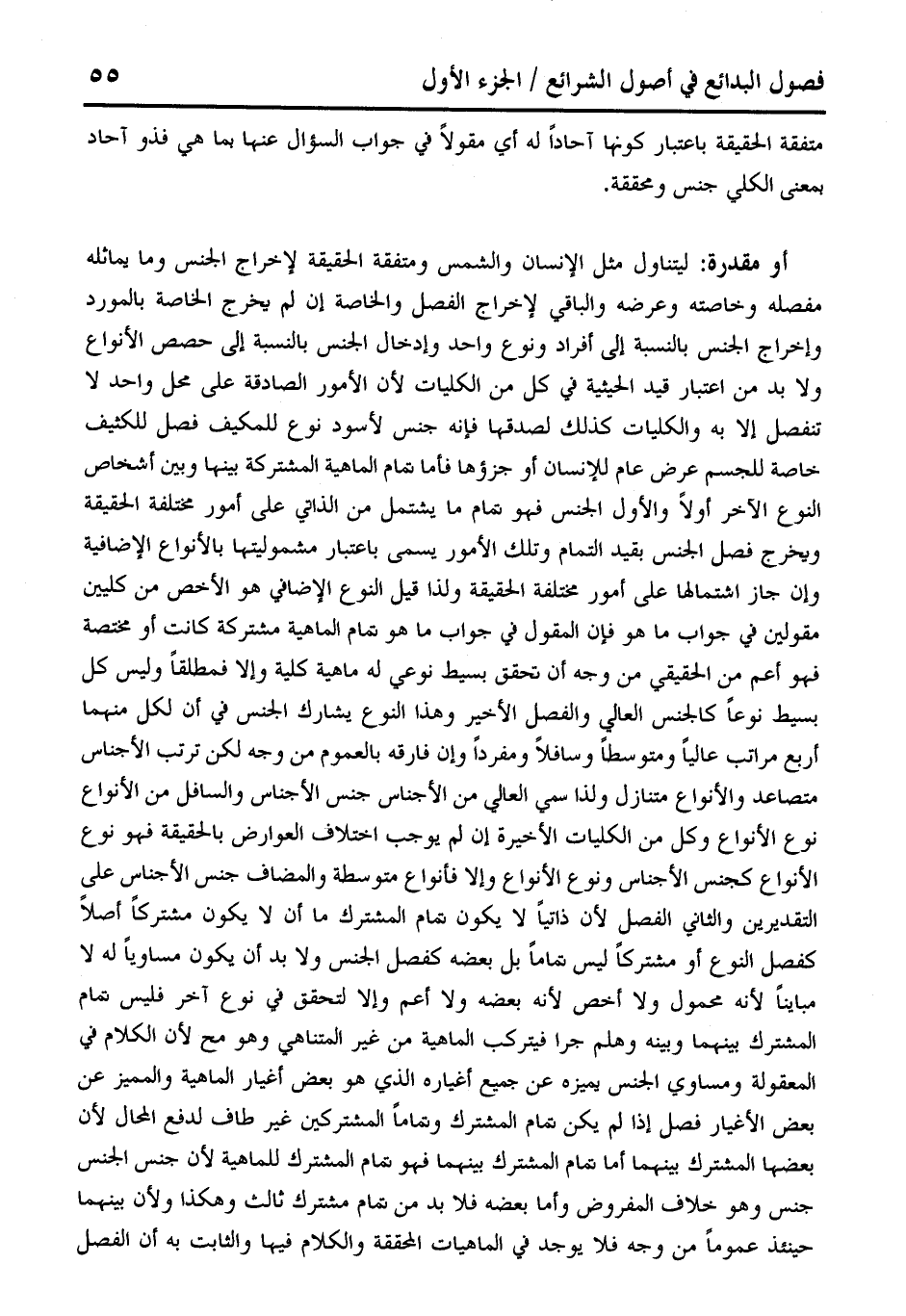 أو مقدرة: ليتناول مثل الإنسان والشمس ومتفقة الحقيقة لإخراج الجنس وما يماثله مفصله وخاصته وعرضه والباقي لإخراج الفصل والخاصة إن لم يخرج الخاصة بالمورد وإخراج الجنس بالنسبة إلى أفراد ونوع واحد وإدخال الجنس بالنسبة إلى حصص الأنواع ولا بد من اعتبار قيد الحيثية في كل من الكليات لأن الأمور الصادقة على محل واحد لا تنفصل إلا به والكليات كذلك لصدقها فإنه جنس لأسود نوع للمكيف فصل للكثيف خاصة للجسم عرض عام للإنسان أو جزؤها فأما تمام الماهية المشتركة بينها وبين أشخاص النوع الآخر أولًا والأول الجنس فهو تمام ما يشتمل من الذاتي على أمور مختلفة الحقيقة ويخرج فصل الجنس بقيد التمام وتلك الأمور يسمى باعتبار مشموليتها بالأنواع الإضافية وإن جاز اشتمالها على أمور مختلفة الحقيقة ولذا قيل النوع الإضافي هو الأخص من كليين مقولين في جواب ما هو فإن المقول في جواب ما هو تمام الماهية مشتركة كانت أو مختصة فهو أعم من الحقيقي من وجه أن تحقق بسيط نوعي له ماهية كلية وإلا فمطلقًا وليس كل بسيط نوعًا كالجنس العالي والفصل الأخير وهذا النوع يشارك الجنس في أن لكل منهما أربع مراتب عاليًا ومتوسطًا وسافلًا ومفردًا وإن فارقه بالعموم من وجه لكن ترتب الأجناس متصاعد والأنواع متنازل ولذا سمي العالي من الأجناس جنس الأجناس والسافل من الأنواع نوع الأنواع وكل من الكليات الأخيرة إن لم يوجب اختلاف العوارض بالحقيقة فهو نوع الأنواع كجنس الأجناس ونوع الأنواع وإلا فأنواع متوسطة والمضاف جنس الأجناس على التقديرين والثاني الفصل لأن ذاتيًا لا يكون تمام المشترك ما أن لا يكون مشتركًا أصلًا كفصل النوع أو مشتركًا ليس تمامًا بل بعضه كفصل الجنس ولا بد أن يكون مساويًا له لا مباينًا لأنه محمول ولا أخص لأنه بعضه ولا أعم وإلا لتحقق في نوع آخر فليس تمام المشترك بينهما وبينه وهلم جرا فيتركب الماهية من غير المتناهي وهو مح لأن الكلام في المعقولة ومساوي الجنس يميزه عن جميع أغياره الذي هو بعض أغيار الماهية والمميز عن بعض الأغيار فصل إذا لم يكن تمام المشترك وتمامًا المشتركين غير طاف لدفع المحال لأن بعضها المشترك بينهما أما تمام المشترك بينهما فهو تمام المشترك للماهية لأن جنس الجنس جنس وهو خلاف المفروض وأما بعضه فلا بد من تمام مشترك ثالث وهكذا ولأن بينهما حينئذ عمومًا من وجه فلا يوجد في الماهيات المحققة والكلام فيها والثابت به أن الفصل