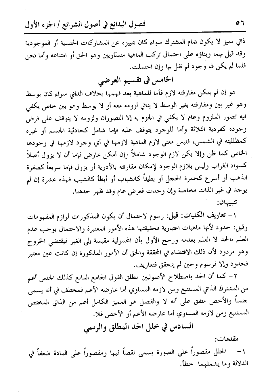 2 - كما أن الحد باصطلاح الأصوليين مطلق القول الجامع المانع كذلك الجنس أعم من المشترك الذاتي المستتبع ومن لازمه المساوي أما عارضه الأعم فمختلف في أنه يسمى جنسًا والأخص متفق على أنه لا والفصل هو المميز الكامل أعم من الذاتي المختص المستتبع ومن لازمه المساوي أما عارضه الأعم أو الأخص فلا.