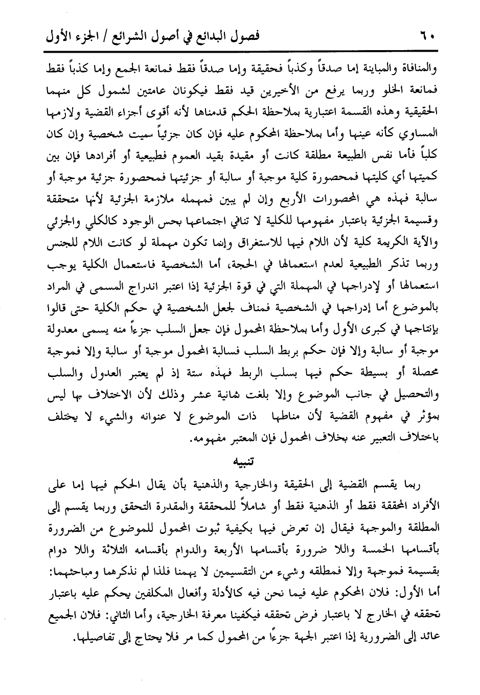 والمنافاة والمباينة إما صدقًا وكذبًا فحقيقة وإما صدقًا فقط فمانعة الجمع وإما كذبًا فقط فمانعة الخلو وربما يرفع من الأخيرين قيد فقط فيكونان عامتين لشمول كل منهما الحقيقية وهذه القسمة اعتبارية بملاحظة الحكم قدمناها لأنه أقوى أجزاء القضية ولازمها المساوي كأنه عينها وأما ملاحظة المحكوم عليه فإن كان جزئيًا سميت شخصية وإن كان كلبًا فأما نفس الطبعة مطلقة كانت أو مقيدة بقيد العموم فطبيعية أو أفرادها فإن بين كميتها أي كليتها فمحصورة كلية موجبة أو سالبة أو جزئيتها فمحصورة جزئية موجبة أو سالبة فهذه هي المحصورات الأربع وإن لم يبين فمهمله ملازمة الجزئية لأنها متحققة وقسيمة الجزئية باعتبار مفهومها للكلية لا تنافي اجتماعها بحس الوجود كالكلي والجزئي والآية الكريمة كلية لأن اللام فيها للاستغراق وإنما تكون مهملة لو كانت اللام للجنس وربما تذكر الطبيعية لعدم استعمالها في الحجة، أما الشخصية فاستعمال الكلية يوجب استعمالها أو لإدراجها في المهملة التي في قوة الجزئية إذا اعتبر اندراج المسمى في المراد بالموضوع أما إدراجها في الشخصية فمناف لجعل الشخصية في حكم الكلية حتى قالوا بإنتاجها في كبرى الأول وأما بملاحظة المحمول فإن جعل السلب جزءًا منه يسمى معدولة موجبة أو سالبة وإلا فإن حكم بربط السلب فسالبة المحمول موجبة أو سالبة وإلا فموجبة محصلة أو بسيطة حكم فيها بسلب الربط فهذه ستة إذ لم يعتبر العدول والسلب والتحصيل في جانب الموضوع وإلا بلغت ثمانية عشر وذلك لأن الاختلاف بها ليس بمؤثر في مفهوم القضية لأن مناطها ذات الموضوع لا عنوانه والشيء لا يختلف باختلاف التعبير عنه بخلاف المحمول فإن المعتبر مفهومه.