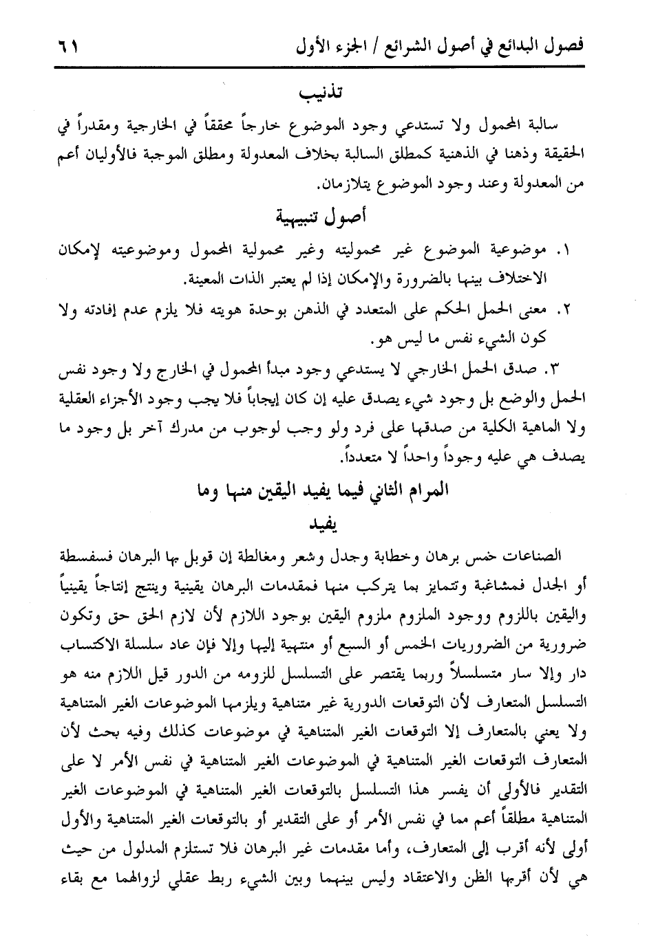 الصناعات خمس برهان وخطابة وجدل وشعر ومغالطة إن قوبل بها البرهان فسفسطة أو الجدل فمشاغبة وتتمايز بما يتركب منها فمقدمات البرهان يقينية وينتج إنتاجًا يقينيًا واليقين باللزوم ووجود الملزوم ملزوم اليقين بوجود اللازم لأن لازم الحق حق وتكون ضرورية من الضروريات الخمس أو السبع أو منتهية إليها وإلا فإن عاد سلسلة الاكتساب دار وإلا سار متسلسلًا وربما يقتصر على التسلسل للزومه من الدور قيل اللازم منه هو التسلسل المتعارف لأن التوقعات الدورية غير متناهية ويلزمها الموضوعات الغير المتناهية ولا يعني بالمتعارف إلا التوقعات الغير المتناهية في موضوعات كذلك وفيه بحث لأن المتعارف التوقعات الغير المتناهية في الموضوعات الغير المتناهية في نفس الأمر لا على التقدير فالأولى أن يفسر هذا التسلسل بالتوقعات الغير المتناهية في الموضوعات الغير المتناهية مطلقًا أعم مما في نفس الأمر أو على التقدير أو بالتوقعات الغير المتناهية والأول أولى لأنه أقرب إلى المتعارف، وأما مقدمات غير البرهان فلا تستلزم المدلول من حيث هي لأن أقربها الظن والاعتقاد وليس بينهما وبين الشيء ربط عقلي لزوالهما مع بقاء