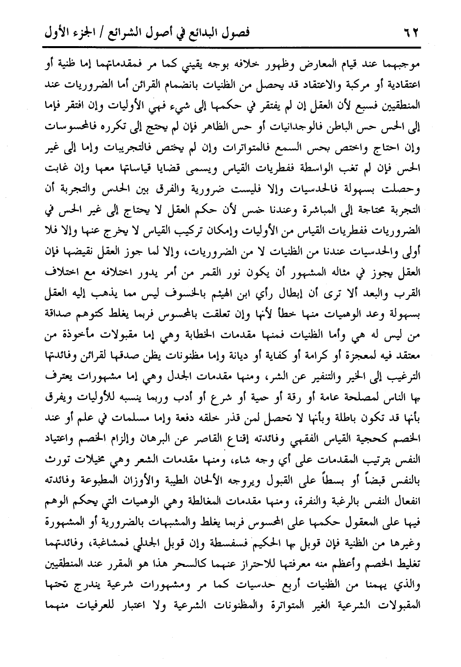 موجبهما عند قيام المعارض وظهور خلافه بوجه يقيني كما مر فمقدماتهما إما ظنية أو اعتقادية أو مركبة والاعتقاد قد يحصل من الظنيات بانضمام القرائن أما الضروريات عند المنطقين فسبع لأن العقل إن لم يفتقر في حكمها إلى شيء فهي الأوليات وإن افتقر فإما إلى الحس حس الباطن فالوجدانيات أو حس الظاهر فإن لم يحتج إلى تكرره فالمحسوسات وإن احتاج واختص بحس السمع فالمتواترات وإن لم يختص فالتجريبات وإما إلى غير الحس فإن لم تغب الواسطة ففطريات القياس ويسمى قضايا قياساتها معها وإن غابت وحصلت بسهولة فالحدسيات وإلا فليست ضرورية والفرق بين الحدس والتجربة أن التجربة محتاجة إلى المباشرة وعندنا خمس لأن حكم العقل لا يحتاج إلى غير الحس في الضروريات ففطريات القياس من الأوليات وإمكان تركيب القياس لا يخرج عنها وإلا فلا أولى والحدسيات عندنا من الظنيات لا من الضروريات، وإلا لما جوز العقل نقيضها فإن العقل يجوز في مثاله المشهور أن يكون نور القمر من أمر يدور اختلافه مع اختلاف القرب والبعد ألا ترى أن إبطال رأي ابن الهيثم بالخسوف ليس مما يذهب إليه العقل بسهولة وعد الوهميات منها خطأ لأنها وإن تعلقت بالمحسوس فربما يغلط كتوهم صداقة من ليس له هي وأما الظنيات فمنها مقدمات الخطابة وهي إما مقبولات مأخوذة من معتقد فيه لمعجزة أو كرامة أو كفاية أو ديانة وإما مظنونات يظن صدقها لقرائن وفائدتها الترغيب إلى الخير والتنفير عن الشر، ومنها مقدمات الجدل وهي إما مشهورات يعترف بها الناس لمصلحة عامة أو رقة أو حمية أو شرع أو أدب وربما ينسبه للأوليات ويفرق بأنها قد تكون باطلة وبأنها لا تحصل لمن قذر خلقه دفعة وإما مسلمات في علم أو عند الخصم كحجية القياس الفقهي وفائدته إقناع القاصر عن البرهان وإلزام الخصم واعتياد النفس بترتيب المقدمات على أي وجه شاء، ومنها مقدمات الشعر وهي مخيلات تورث بالنفس قبضًا أو بسطًا على القبول ويروجه الألحان الطيبة والأوزان المطبوعة وفائدته انفعال النفس بالرغبة والنفرة، ومنها مقدمات المغالطة وهي الوهميات التي يحكم الوهم فيها على المعقول حكمها على المحسوس فربما يغلط والمشبهات بالضرورية أو المشهورة وغيرها من الظنية فإن قوبل بها الحكيم فسفسطة وإن قوبل الجدلي فمشاغبة، وفائدتهما تغليط الخصم وأعظم منه معرفتها للاحتراز عنهما كالسحر هذا هو المقرر عند المنطقيين والذي يهمنا من الظنيات أربع حدسيات كما مر ومشهورات شرعية يندرج تحتها المقبولات الشرعية الغير المتواترة والمظنونات الشرعية ولا اعتبار للعرفيات منهما