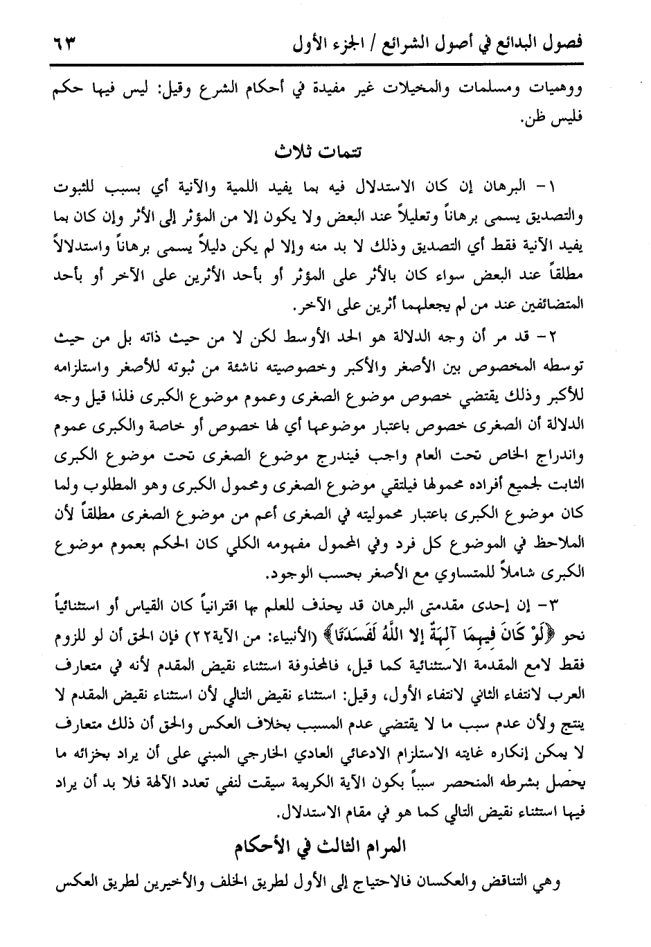 3 - إن إحدى مقدمتي البرهان قد يحذف للعلم بها اقترانيًا كان القياس أو استثنائيًا نحو {لَوْ كانَ فِيهِمَا آلِهَةٌ إلا الله لَفَسَدَتَا} [الأنبياء: من الآية 22] فإن الحق أن لو للزوم فقط لا مع المقدمة الاستثنائيةكما قيل، فالمحذوفة استثناء نقيض المقدم لأنه في متعارف العرب لانتفاء الثاني لانتفاء الأول، وقيل: استثناء نقيض التالي لأن استثناء نقيض المقدم لا ينتج ولأن عدم سبب ما لا يقتضي عدم المسبب بخلاف العكس والحق أن ذلك متعارف لا يمكن إنكاره غايته الاستلزام الادعائي العادي الخارجي المبني على أن يراد بخزائه ما يحصل بشرطه المنحصر سببًا يكون الآية الكريمة سيقت لنفي تعدد الآلهة فلا بد أن يراد فيها استثناء نقيض التالي كما هو في مقام الاستدلال.