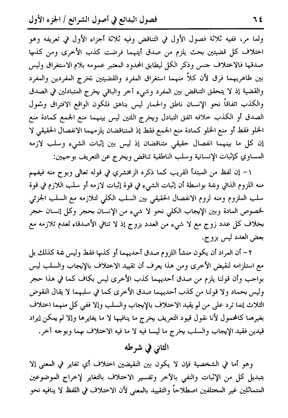 الأول في تعريفه وهو اختلاف كل قضيتين بحث يلزم من صدق أيتهما فرضت كذب الأخرى ومن كذبها صدقها فالاختلاف جنس وذكر الكل ليطابق المحدود المعتبر عمومه بلام الاستغراق وليس بين ظاهريهما فرق لأن كلًا منهما استغراق المفرد والقضيتين تخرج المفردين والمفرد والقضية إذ لا يتحقق التناقض بين المفرد وشيء آخر والباقي يخرج المتبادلين في الصدق والكذب اتفاقًا نحو الإنسان ناطق والحمار ليس بناهق فلكون الواقع الافتراق وشمول الصدق أو الكذب خلافه اتفق التبادل ويخرج اللتين ليس بينهما منع الجمع كمادة منع الخلو فقط أو منع الخلو كمادة منع الجمع فقط إذ المتناقضان يلزمهما الانفصال الحقيقي لا إن كل ما بينهما انفصال حقيقي متناقضان إذ ليس بين إثبات الشيء وسلب لازمه المساوي كإثبات الإنسانية وسلب الناطقية تناقض ويخرج عن التعريف بوجهين: