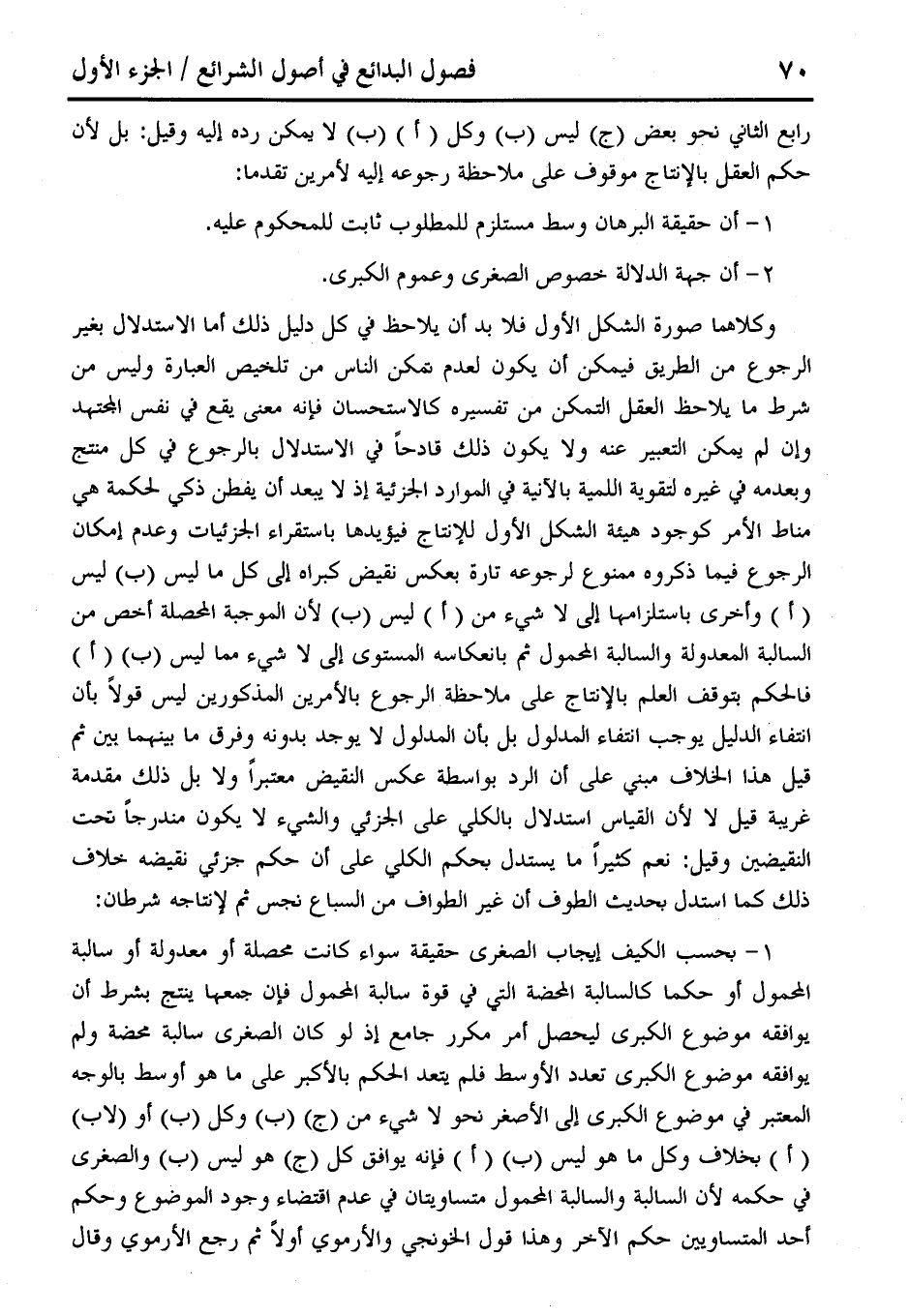 وكلاهما صورة الشكل الأول فلا بد أن يلاحظ في كل دليل ذلك أما الاستدلال بغير الرجوع من الطريق فيمكن أن يكون لعدم تمكن الناس من تلخيص العبارة وليس من شرط ما يلاحظ العقل التمكن من تفسيره كالاستحسان فإنه معنى يقع في نفس المجتهد وإن لم يمكن التعبير عنه ولا يكون ذلك قادحًا في الاستدلال بالرجوع في كل منتج وبعدمه في غيره لتقوية اللمية بالآنية في الموارد الجزئية إذ لا يبعد أن يفطن ذكي لحكمة هي مناط الأمر كوجود هيئة الشكل الأول للإنتاج فيؤيدها باستقراء الجزئيات وعدم إمكان الرجوع فيما ذكروه ممنوع لرجوعه تارة بعكس نقيض كبراه إلى كل ما ليس (ب) ليس (أ) وأخرى باستلزامها إلى لا شيء من (أ) ليس (ب) لأن الموجبة المحصلة أخص من السالبة المعدولة والسالبة المحمول ثم بانعكاسه المستوى إلى لا شيء مما ليس (ب) (أ) فالحكم بتوقف العلم بالإنتاج على ملاحظة الرجوع بالأمرين المذكورين ليس قولًا بأن انتفاء الدليل يوجب انتفاء المدلول بل بأن المدلول لا يوجد بدونه وفرق ما بينهما بين ثم قيل هذا الخلاف مبني على أن الرد بواسطة عكس النقيض معتبرًا ولا بل ذلك مقدمة غريبة قيل لا لأن القياس استدلال بالكلي على الجزئي والشيء لا يكون مندرجًا تحت النقيضين وقيل: نعم كثيرًا ما يستدل بحكم الكلي على أن حكم جزئي نقيضه خلاف ذلك كما استدل بحديث الطوف أن غير الطواف من السباع نجس ثم لإنتاجه شرطان: