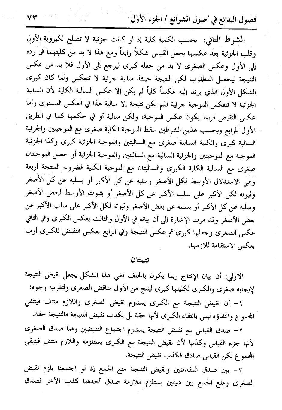 الشرط الثاني: بحسب الكمية كلية إذ لو كانت جزئية لا تصلح لكبروية الأول وقلب الجزئية بعد عكسها يجعل القياس شكلًا رابعًا ومع هذا لا بد من كليتهما في رده إلى الأول وعكس الصغرى لا بد من جعله كبرى ليرجع إلى الأول فلا بد من عكس النتيجة ليحصل المطلوب لكن النتيجة حينئذ سالبة جزئية لا تنعكس ولما كان كبرى الشكل الأول الذي يرتد إليه عكسًا كليًا لم يكن إلا عكس السالبة الكلية لأن السالبة الجزئية لا تنعكس الموجبة جزئية فلم يكن نتيجة إلا سالبة هذا في العكس المستوى وأما عكس النقيض فربما يكون عكس الموجبة، ولكن سالبة أو في حكمها كما في الطريق الأول للرابع وبحسب هذين الشرطين سقط الموجبة الكلية صغرى مع الموجبتين والجزئية السالبة كبرى والكلية السالبة صغرى مع السالبتين والموجبة الجزئية كبرى وكذا الجزئية الموجبة مع الموجبتين والجزئية السالبة مع السالبتين والموجبة الجزئية أو حصل الموجبتان صغرى مع السالبة الكلية الكبرى والسالبتان مع الموجبة الكلية فضروبه المنتجة أربعة وهي الاستدلال الأوسط لكل الأصغر وسلبه عن كل الأكبر أو بسلبه عن كل الأصغر وثبوته لكل الأكبر على سلب الأكبر عن كل الأصغر أو بثبوت الأوسط لبعض الأصغر وسلبه عن كل الأكبر أو بسلبه عن بعض الأصغر وثبوته لكل الأكبر على سلب الأكبر عن بعض الأصغر وقد مرت الإشارة إلى أن بيانه في الأول والثالث بعكس الكبرى وفي الثاني عكس الصغرى وجعلها كبرى ثم عكس النتيجة وفي الرابع بعكس النقيض للكبرى أو بعكس الاستقامة للازمها.