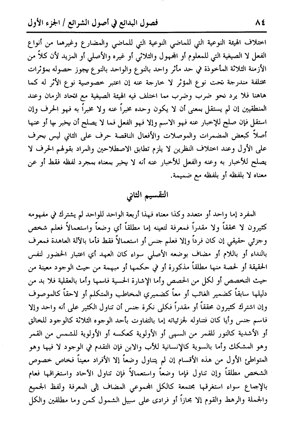 المفرد إما واحد أو متعدد وكذا معناه فهذا أربعة الواحد للواحد لم يشترك في مفهومه كثيرون لا محققًا ولا مقدرًا فمعرفة لتعينه إما مطلقًا أي وضعًا واستعمالًا فعلم شخص وجزئي حقيقي إن كان فردًا وإلا فعلم جنس أو استعمالًا فقط فأما بالآلة العاهدة فمعرف بالنداء أو باللام أو مضاف بوضعه الأصلي سواء كان العهد أي اعتبار الحضور لنفس الحقيقة أو لحصة منها مطلقًا مذكورة أو في حكمها أو مبهمة من حيث الوجود معينة من حيث التخصص أو لكل من الحصص وأما الإشارة الحسية فاسمها وأما بالعقلية فلا بد من دليلها سابقًا كضمير الغائب أو معًا كضميري المخاطب والمتكلم أو لاحقًا كالموصوف وإن اشترك كثيرون محققًا أو مقدرًا فكلي نكرة جنس أن تناول الكثير على أنه واحد وإلا قاسم جنس وأيا كان فتناوله لجزئياته إما بالتفاوت بأحد الوجوه الثلاثة كالوجود للخالق أو الأشدية كالنور للقمر من السهى أو الأولوية كعكسه أو الأولوية للشمس من القمر وهو المشكك وأما بالسوية كالإنسانية للأب والابن فإن المتقدم في الوجود لا فيها وهو المتواطيء الأول من هذه الأقسام إن لم يتناول وضعًا إلا الأفراد معينًا فخاص خصوص الشخص مطلقًا وإن تناول فإما وضعًا واستعمالًا فإن تناول الآحاد واستغراقها فعام بالإجماع سواء استغرقها مجتمعة كالكل المجموعي المضاف إلى المعرفة ولفظ الجميع والجملة والرهط والقوم إلا مجازًا أو فرادى على سبيل الشمول كمن وما مطلقين والكل