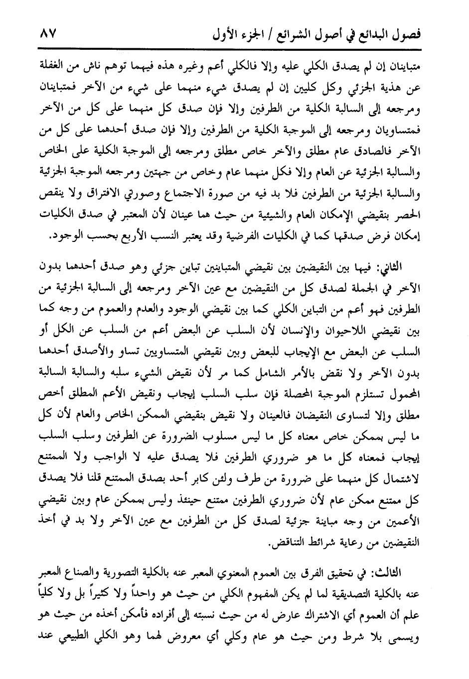 الثاني: فيها بين النقيضين بين نقيضي المتباينين تباين جزئي وهو صدق أحدهما بدون الآخر في الجملة لصدق كل من النقيضين مع عين الآخر ومرجعه إلى السالبة الجزئية من الطرفين فهو أعم من التباين الكلي كما بين نقيضي الوجود والعدم والعموم من وجه كما بين نقيض اللاحيوان والإنسان لأن السلب عن البعض أعم من السلب عن الكل أو السلب عن البعض مع الإيجاب للبعض وبين نقيضي المتساويين تساو والأصدق أحدهما بدون الآخر ولا نقض بالأمر الشامل كما مر لأن نقيض الشيء سلبه والسالبة السالبة المحمول تستلزم الموجبة المحصلة فإن سلب السلب إيجاب ونقيض الأعم المطلق أخص مطلق وإلا لتساوى النقيضان فالعينان ولا نقيض بنقيضي الممكن الخاص والعام لأن كل ما ليس بممكن خاص معناه كل ما ليس مسلوب الضرورة عن الطرفين وسلب السلب إيجاب فمعناه كل ما هو ضروري الطرفين فلا يصدق عليه لا الواجب ولا الممتنع لاشتمال كل منهما على ضرورة من طرف ولئن كابر أحد بصدق الممتنع قلنا فلا يصدق كل ممتنع ممكن عام لأن ضروري الطرفين ممتنع حينئذ وليس بممكن عام وبين نقيضي الأعمين من وجه مباينة جزئية لصدق كل من الطرفين مع عين الآخر ولا بد في أخذ النقيضين من رعاية شرائط التناقض.