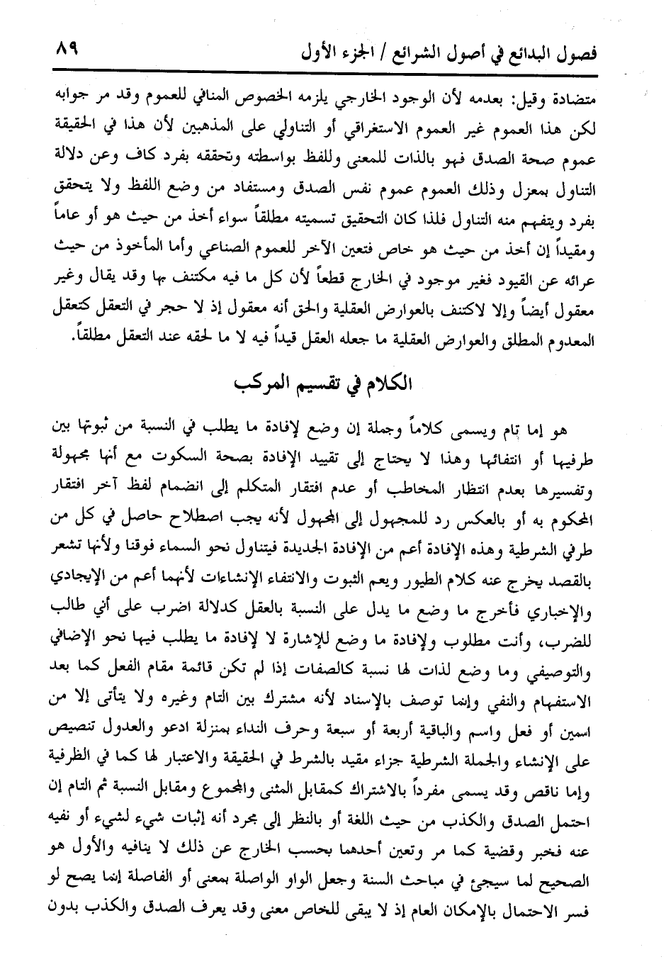 هو إما تام ويسمى كلامًا وجملة إن وضع لإفادة ما يطلب في النسبة من ثبوتها بين طرفيها أو انتفائها وهذا لا يحتاج إلى تقييد الإفادة بصحة السكوت مع أنها مجهوله وتفسيرها بعدم انتظار المخاطب أو عدم افتقار المتكلم إلى انضمام لفظ آخر افتقار المحكوم به أو بالعكس رد للمجهول إلى المجهول لأنه يجب اصطلاح حاصل في كل من طرفي الشرطية وهذه الإفادة أعم من الإفادة الجديدة فيتناول نحو السماء فوقنا ولأنها تشعر بالقصد يخرج عنه كلام الطيور ويعم الثبوت والانتفاء الإنشاءات لأنهما أعم من الإيجادي والإخباري فأخرج ما وضع ما يدل على النسبة بالعقل كدلاله اضرب على أني طالب للضرب، وأنت مطلوب ولإفادة ما وضع للإشارة لا لإفادة ما يطلب فيها نحو الإضافي والتوصيفي وما وضع لذات لها نسبة كالصفات إذا لم تكن قائمة مقام الفعل كما بعد الاستفهام والنفي وإنما توصف بالإسناد لأنه مشترك بين التام وغيره ولا يتأتى إلا من اسمين أو فعل واسم والباقية أربعة أو سبعة وحرف النداء بمنزلة ادعو والعدول تنصيص على الإنشاء والجملة الشرطية جزاء مقيد بالشرط في الحقيقة والاعتبار لها كما في الظرفية وإما ناقص وقد يسمى مفردًا بالاشتراك كمقابل المثنى والمجموع ومقابل النسبة ثم التام إن احتمل الصدق والكذب من حيث اللغة أو بالنظر إلى مجرد أنه إثبات شيء لشيء أو نفيه عنه فخبر وقضية كما مر وتعين أحدهما بحسب الخارج عن ذلك لا ينافيه والأول هو الصحيح لما سيجيء في مباحث السنة وجعل الواو الواصلة بمعنى أو الفاصلة إنما يصح لو فسر الاحتمال بالإمكان العام إذ لا يبقى للخاص معنى وقد يعرف الصدق والكذب بدون