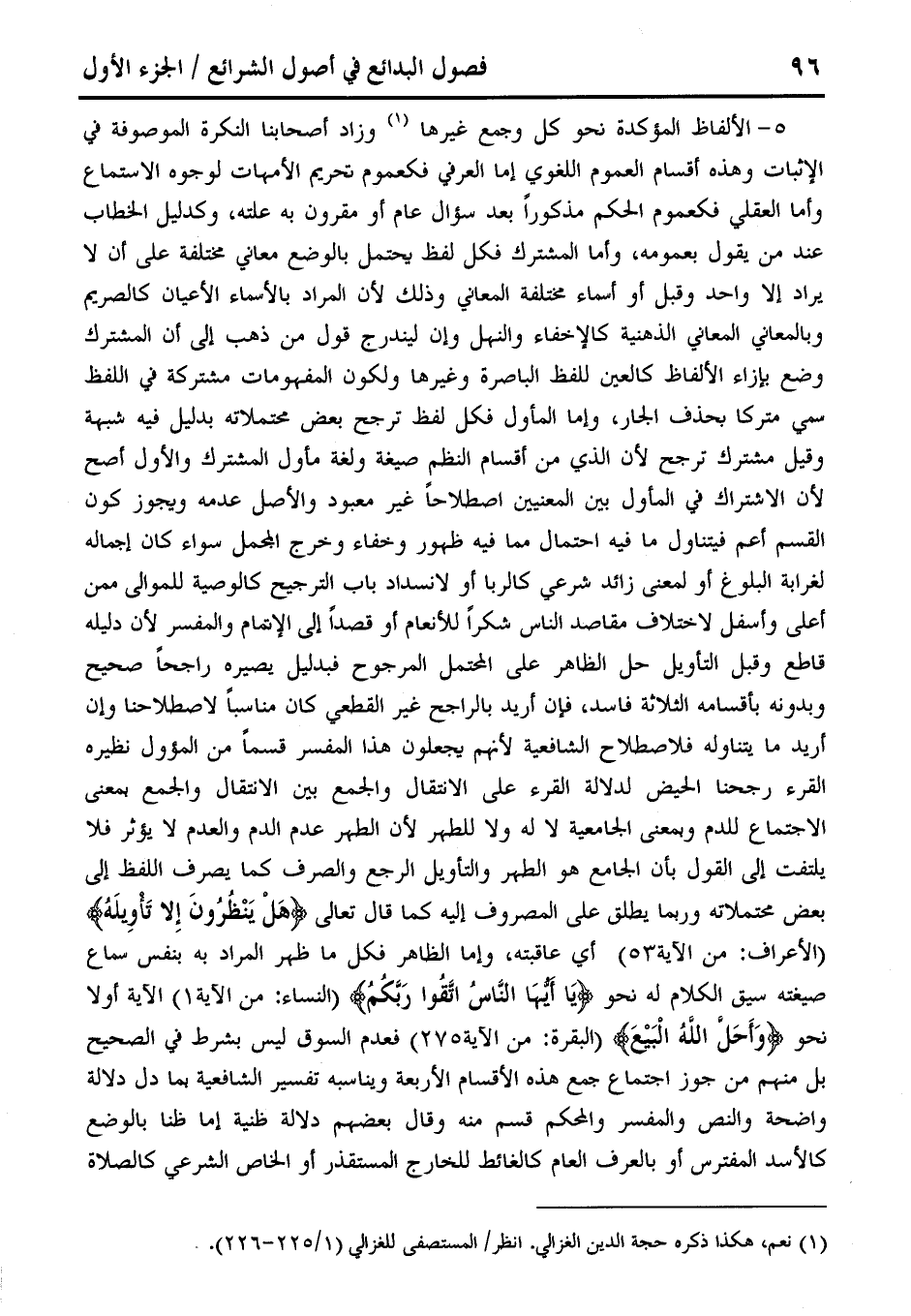 5 - الألفاظ المؤكدة نحو كل وجمع غيرها (¬1) وزاد أصحابنا النكرة الموصوفة في الإثبات وهذه أقسام العموم اللغوي إما العرفي فكعموم تحريم الأمهات لوجوه الاستماع وأما العقلي فكعموم الحكم مذكورًا بعد سؤال عام أو مقرون به علته، وكدليل الخطاب عند من يقول بعمومه، وأما المشترك فكل لفظ يحتمل بالوضع معاني مختلفة على أن لا يراد إلا واحد وقبل أو أسماء مختلفة المعاني وذلك لأن المراد بالأسماء الأعيان كالصريم وبالمعاني المعاني الذهنية كالإخفاء والنهل وإن ليندرج قول من ذهب إلى أن المشترك وضع بإزاء الألفاظ كالعين للفظ الباصرة وغيرها ولكون المفهومات مشتركة في اللفظ سمي متركا بحذف الجار، وإما المأول فكل لفظ ترجح بعض محتملاته بدليل فيه شبهة وقيل مشترك ترجح لأن الذي من أقسام النظم صيغة ولغة مأول المشترك والأول أصح لأن الاشتراك في المأول بين المعنين اصطلاحًا غير معبود والأصل عدمه ويجوز كون القسم أعم فيتناول ما فيه احتمال مما فيه ظهور وخفاء وخرج المجمل سواء كان إجماله لغرابة البلوغ أو لمعنى زائد شرعي كالربا أو لانسداد باب الترجيح كالوصية للموالي ممن أعلى وأسفل لاختلاف مقاصد الناس شكرًا للأنعام أو قصدًا إلى الإتمام والمفسر لأن دليله قاطع وقبل التأويل حل الظاهر على المحتمل المرجوح فبدليل يصيره راجحًا صحيح وبدونه بأقسامه الثلاثة فاسد، فإن أريد بالراجح غير القطعي كان مناسبًا لاصطلاحنا وإن أريد ما يتناوله فلاصطلاح الشافعية لأنهم يجعلون هذا المفسر قسمًا من المؤول نظيره القرء رجحنا الحيض لدلالة القرء على الانتقال والجمع بين الانتقال والجمع بمعنى الاجتماع للدم وبمعنى الجامعية لا له ولا للطهر لأن الطهر عدم الدم والعدم لا يؤثر فلا يلتفت إلى القول بأن الجامع هو الطهر والتأويل الرجع والصرف كما يصرف اللفظ إلى بعض محتملاته وربما يطلق على المصروف إليه كما قال تعالى {هَلْ يَنْظُرُونَ إِلا تَأوِيلَهُ} [الأعراف: من الآية 53] أي عاقبته، وإما الظاهر فكل ما ظهر المراد به بنفس سماع صيغته سيق الكلام له نحو {يَا أيُّهَا النُّاسُ اتَّقُوا رَبَّكُمُ} [النساء: من الآية 1] الآية أولًا نحو {وَأَحَلَّ الله الْبَيْعَ} [البقرة: من الآية 275] فعدم السوق ليس بشرط في الصحيح بل منهم من جوز اجتماع جمع هذه الأقسام الأربعة ويناسبه تفسير الشافعية بما دل دلالة واضحة والنص والمفسر والمحكم قسم منه وقال بعضهم دلالة ظنية إما ظنا بالوضع كالأسد المفترس أو بالعرف العام كالغائط للخارج المستقذر أو الخاص الشرعي كالصلاة