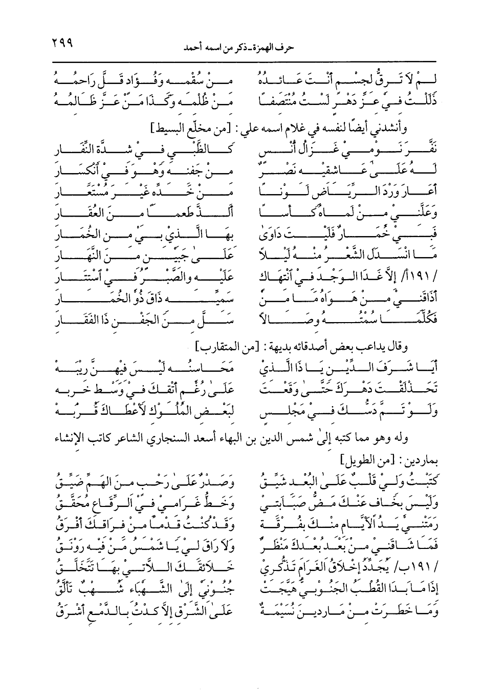 وله وهو مما كتبه إلى شمس الدين بن البهاء أسعد السنجاري الشاعر كاتب الإنشاء بماردين: [من الطويل]