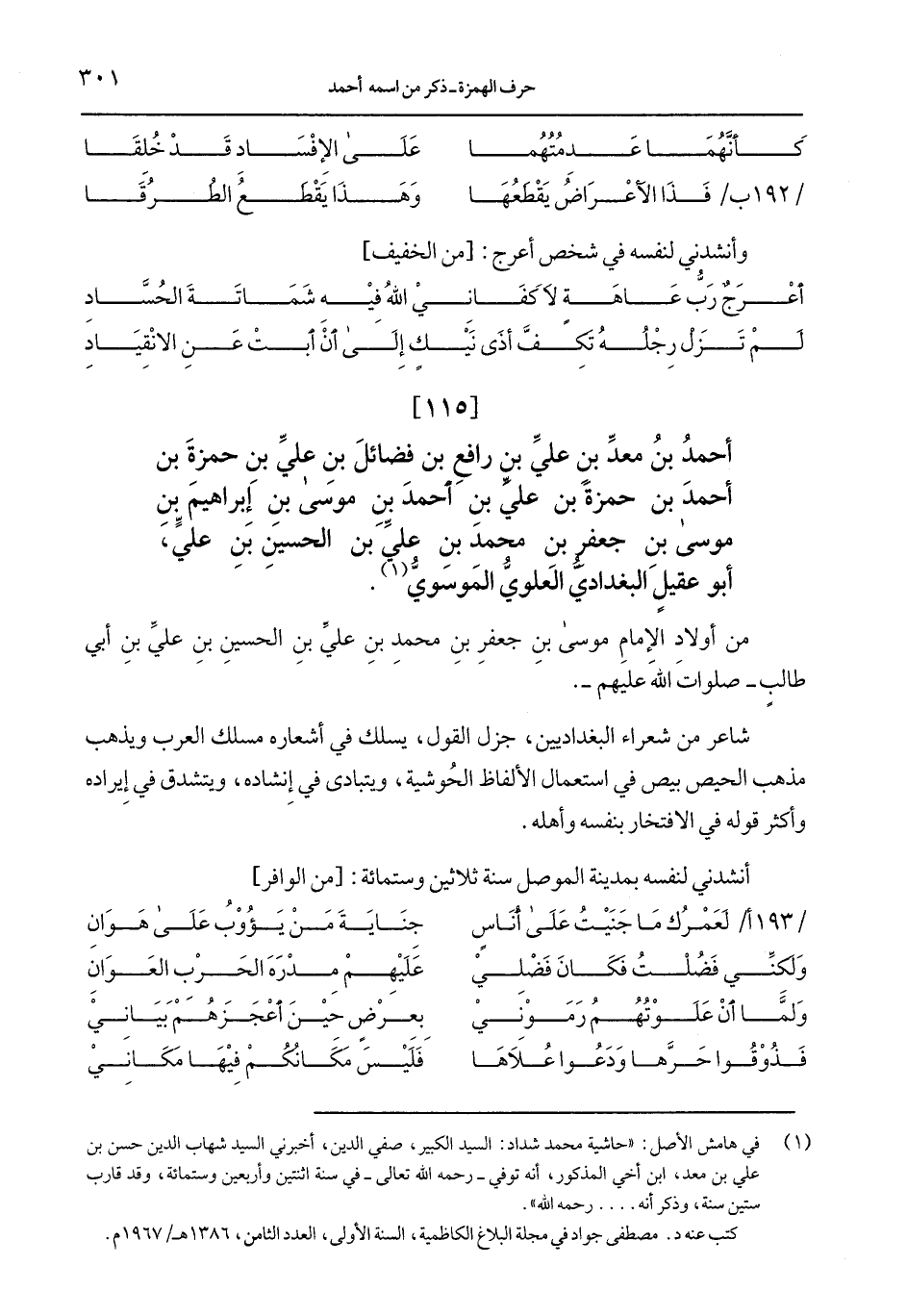 من أولاد الإمام موسى بن جعفر بن محمد بن عليِّ بن الحسين بن عليِّ بن أبي طالب – صلوات الله عليهم -.