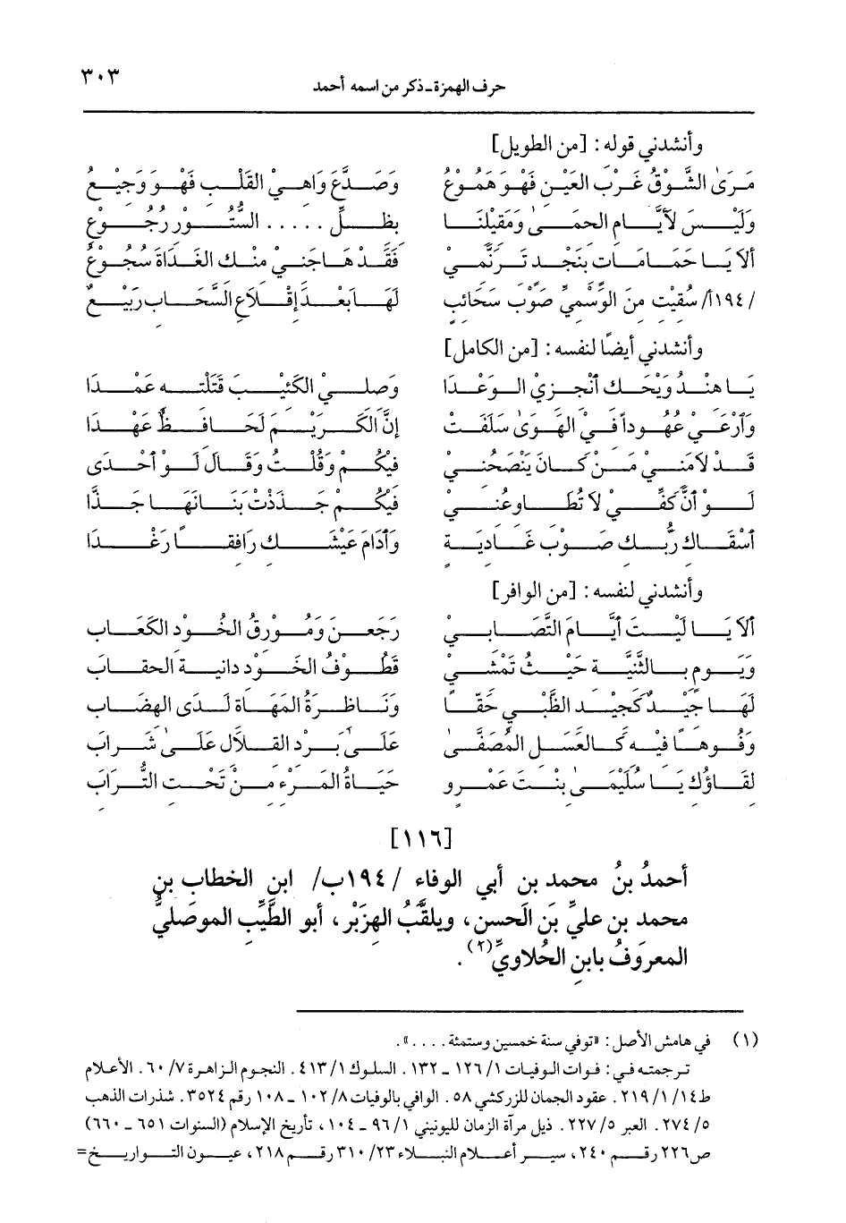 أحمد بن محمد بن أبي الوفاء /194 ب/ ابن الخطاب بن محمد بن عليِّ بن الحسن، ويلقب الهزبر، أبو الطَّيِّب الموصليُّ المعروف بابن الحلاويِّ.