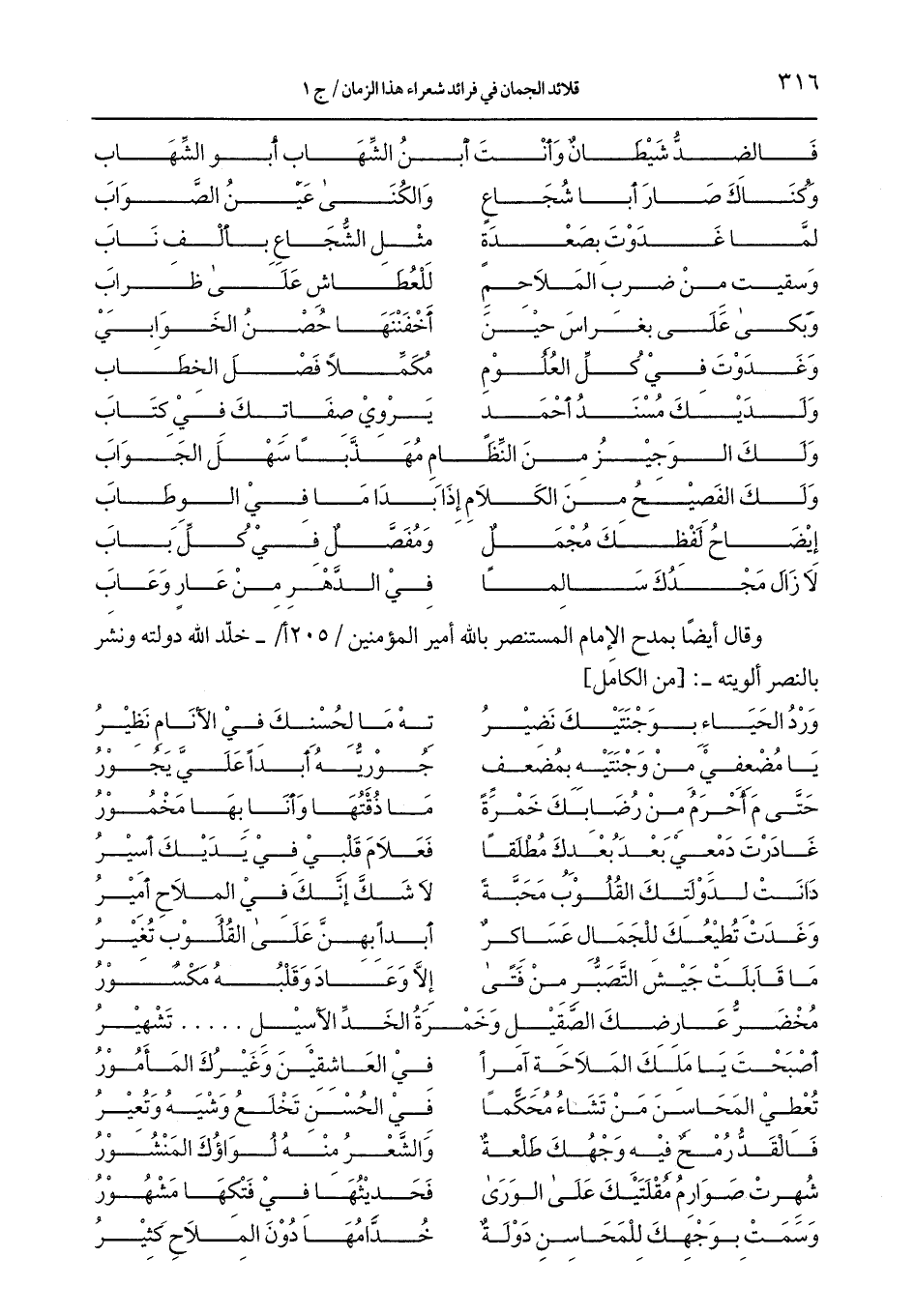 وقال أيضًا بمدح الإمام المستنصر بالله أمير المؤمنين /205 أ/ -خلّد الله دولته ونشر بالنصر ألويته-: [من الكامل]