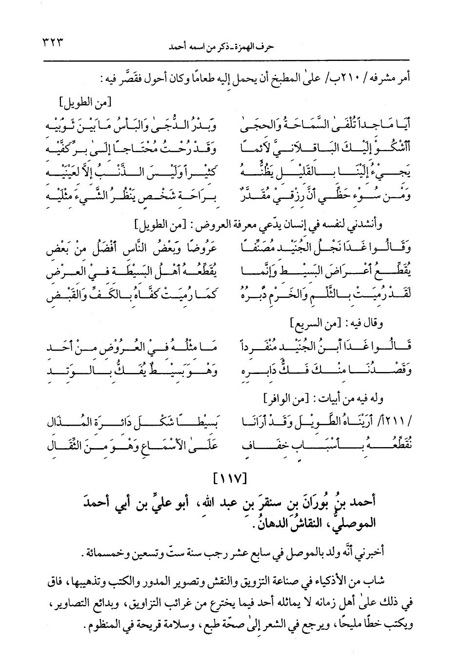 شاب من الأذكياء في صناعة التزويق والنقش وتصوير المدور والكتب وتذهيبها، فاق في ذلك على أهل زمانه لا يماثله أحد فيما يخترع من غرائب التزاويق، وبدائع التصاوير، ويكتب خطًا مليحًا، ويرجع في الشعر إلى صحّة طبع، وسلامة قريحة في المنظوم.