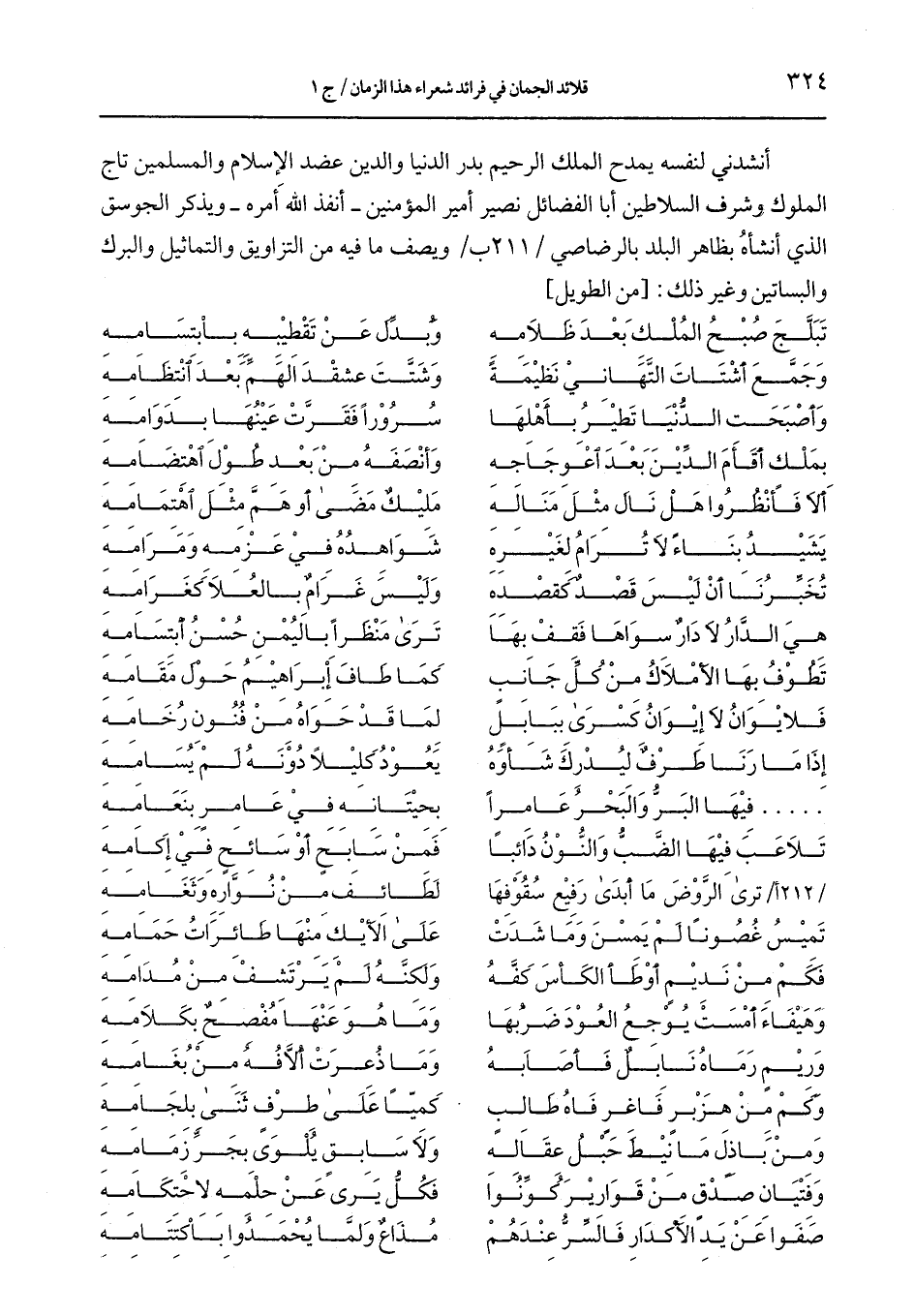 /212 أ/ ترى الرَّوض ما أبدى رفيع سقوفها ... لطائف من نوَّاره وثغامه