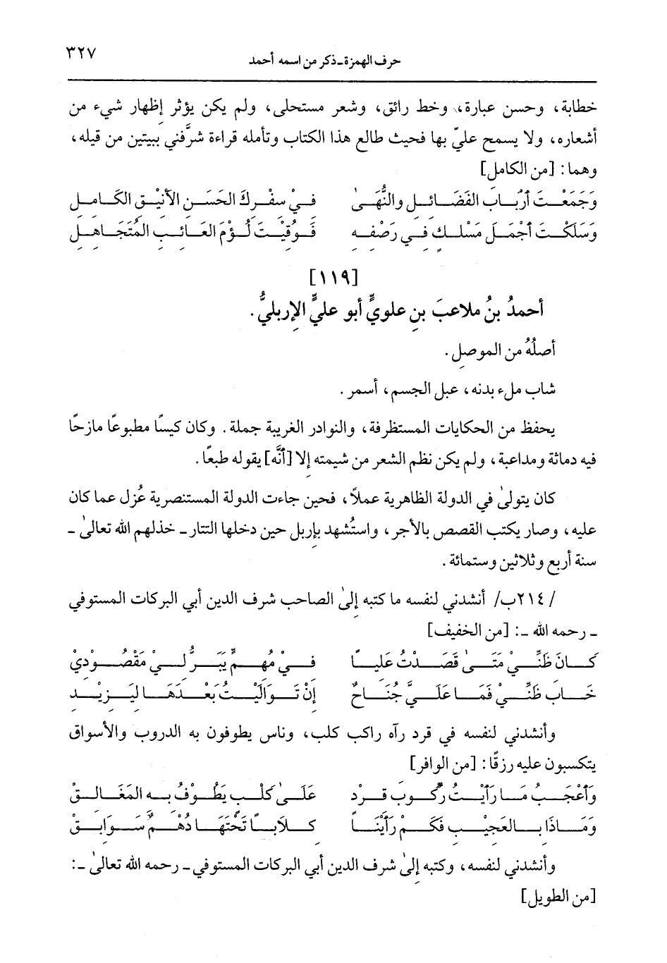 /214 ب/ أنشدني لنفسه ما كتبه إلى الصاحب شرف الدين أبي البركات المستوفي- رحمه الله-: [من الخفيف]