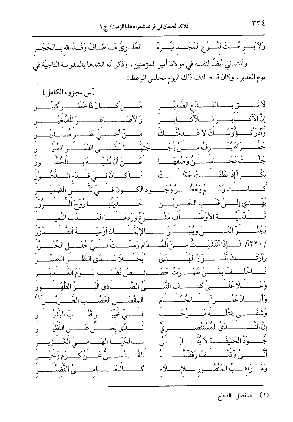 وأنشدني أيضًا لنفسه في مولانا أمير المؤمنين، وذكر أنه أنشدها بالمدرسة التاجيّة في يوم الغدير. وكان قد صادف ذلك اليوم مجلس الوعظ:
