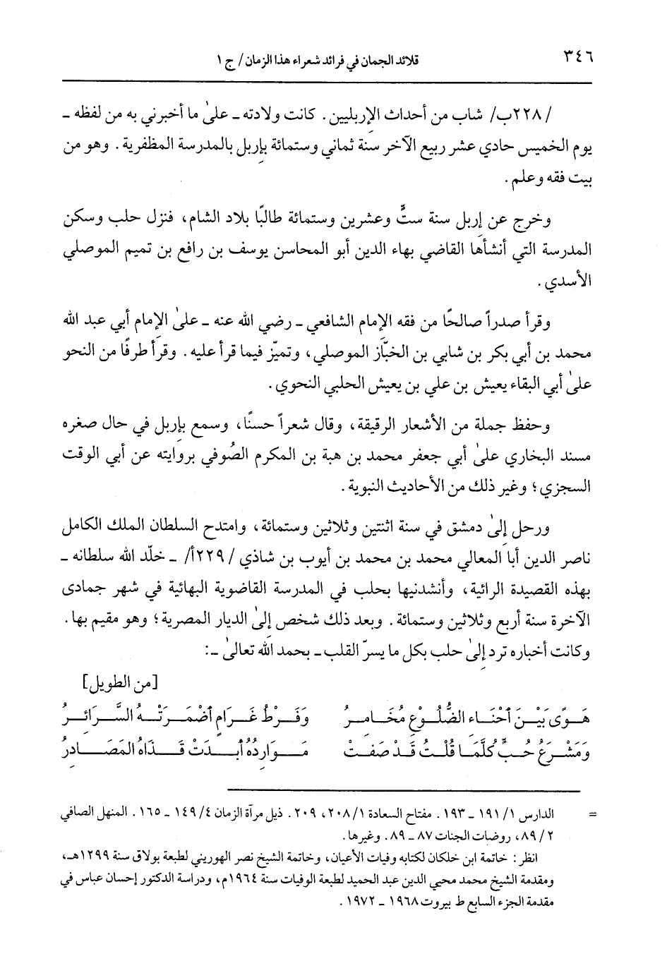/228 ب/ شاب من أحداث الإربليين. كانت ولادته- على ما أخبرني به من لفظه- يوم الخميس حادي عشر ربيع الآخر سنة ثماني وستمائة بإربل بالمدرسة المظفرية. وهو من بيت فقه وعلم.