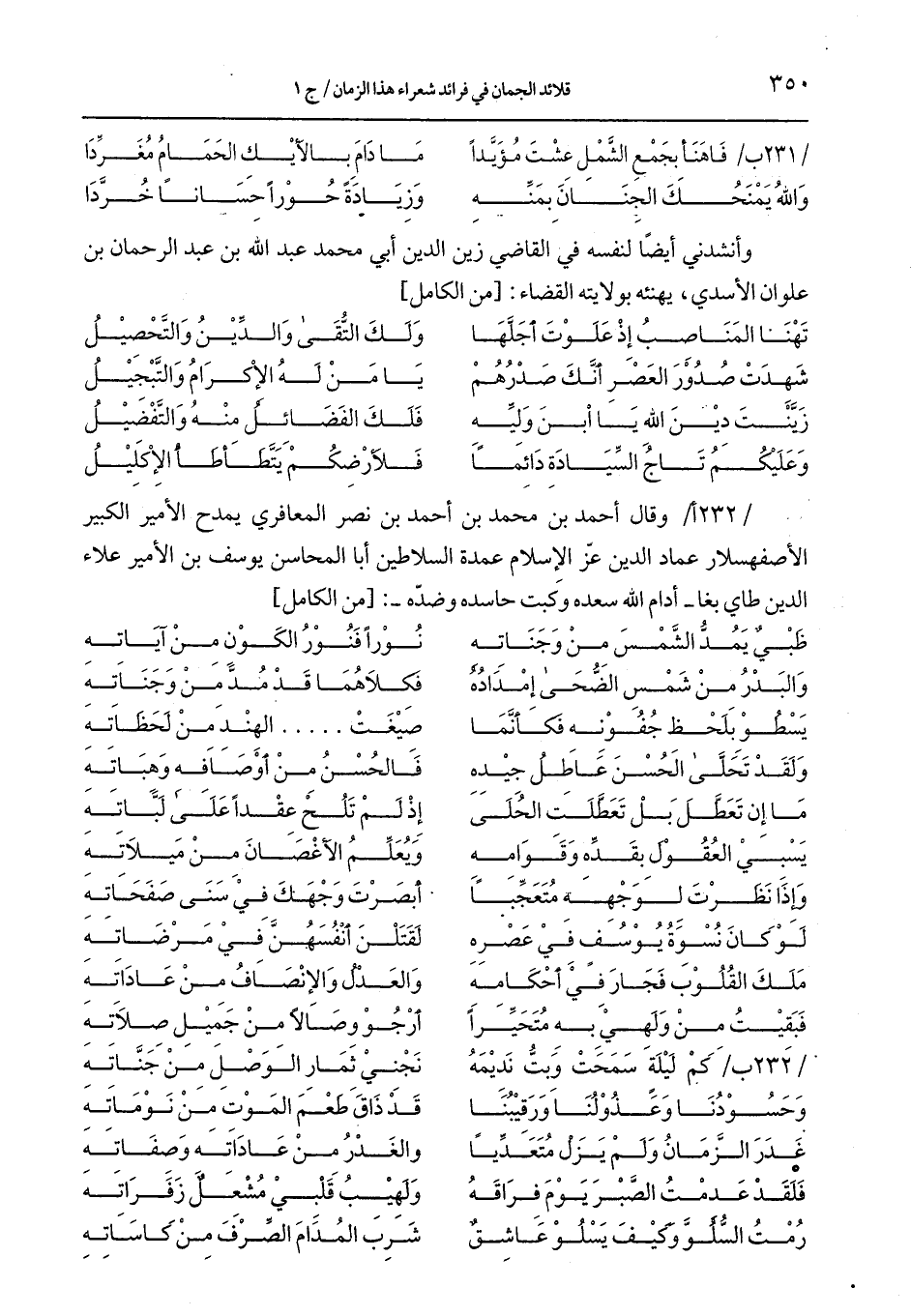 /232 أ/ وقال أحمد بن محمد بن أحمد بن نصر المعافري يمدح الأمير المعافري يمدح الأمير الكبير الأصفهسلار عماد الدين عزّ الإسلام عمدة السلاطين أبا المحاسن يوسف بن الأمير علاء الدين طاي بغا- أدام الله سعده وكبت حاسده وضدّه-: [من الكامل]