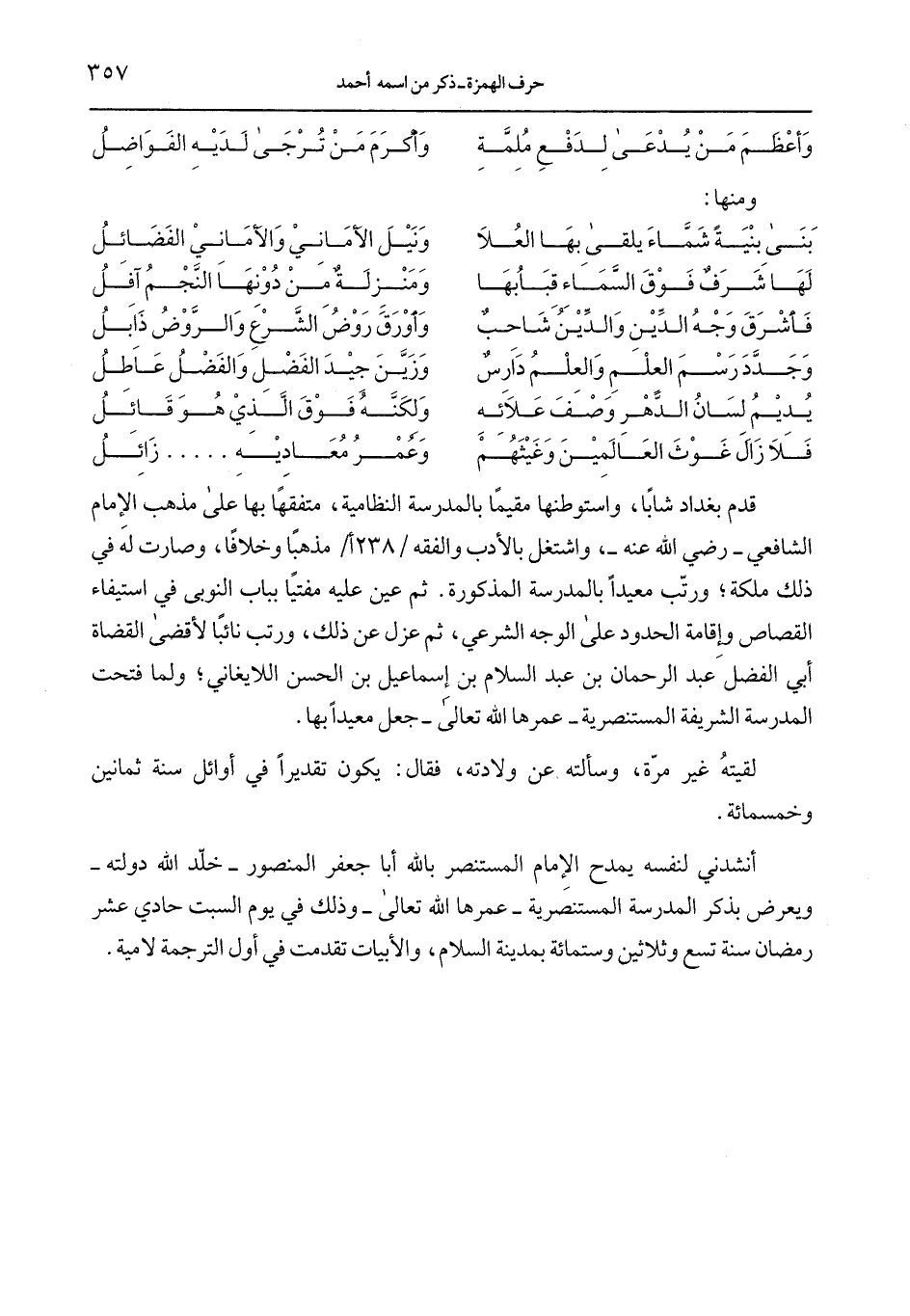 أنشدني لنفسه يمدح الإمام المستنصر بالله أبا جعفر المنصور-خلّد الله دولته- ويعرض بذكر المدرسة المستنصرية- عمرها الله تعالى- وذلك في يوم السبت حادي عشر رمضان سنة تسع وثلاثين وستمائة بمدينة السلام، والأبيات تقدمت في أول الترجمة لامية.