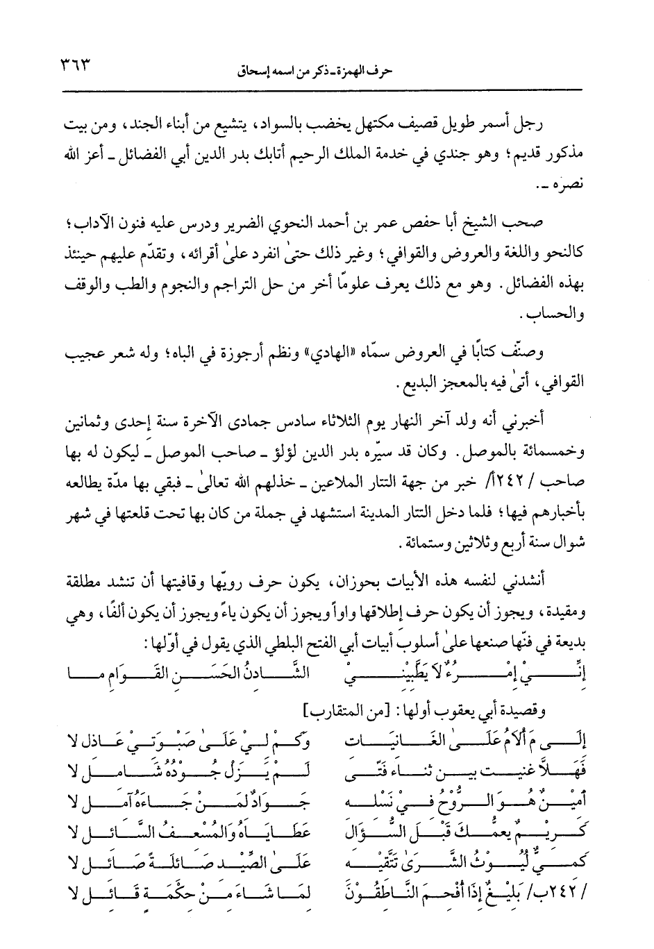 رجل أسمر طويل قصيف مكتهل يخضب بالسواد، يتشتيع من أبناء الجند، ومن بيت مذكو قديم؛ وهو جندي في خدمة الملك الرحيم أتابك بدر الدين أبي الفضائل- أعز الله نصره-.