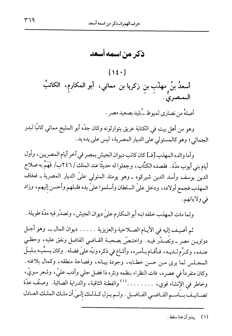 وأما والده المهذب [فـ] كان كاتب ديوان الجيش بمصر في آخر أيام المصريين, وأول أيام بني أيوب مدّة. فقصده الكتَّاب, وجعلوا له حديثًا عند الملك /246 ب/ فهمَّ به صلاح الدين يوسف وأسد الدين شيركوه- وهو يومئذ المتولي على الديار المصرية- فخاف المهذب فجمع أولاده, ودخل على السلطان وأسلموا على يده فقبلهم وأحسن إليهم, وزاد في ولاياتهم.