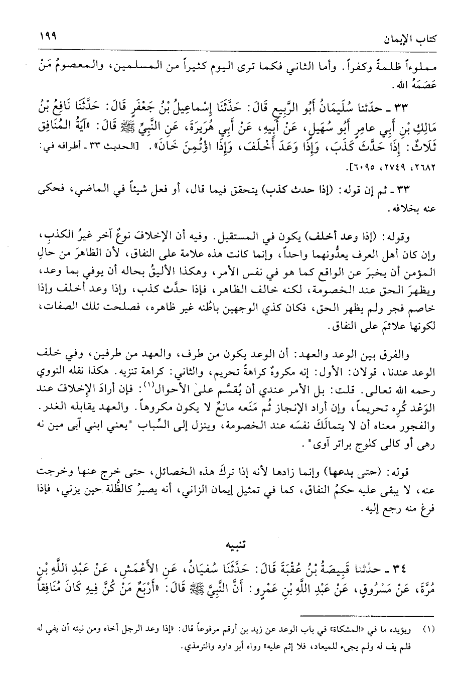 33 - حَدَّثَنَا سُلَيْمَانُ أَبُو الرَّبِيعِ قَالَ حَدَّثَنَا إِسْمَاعِيلُ بْنُ جَعْفَرٍ قَالَ حَدَّثَنَا نَافِعُ بْنُ مَالِكِ بْنِ أَبِى عَامِرٍ أَبُو سُهَيْلٍ عَنْ أَبِيهِ عَنْ أَبِى هُرَيْرَةَ عَنِ النَّبِىِّ - صلى الله عليه وسلم - قَالَ «آيَةُ الْمُنَافِقِ ثَلاَثٌ إِذَا حَدَّثَ كَذَبَ، وَإِذَا وَعَدَ أَخْلَفَ، وَإِذَا اؤْتُمِنَ خَانَ». أطرافه 2682، 2749، 6095 - تحفة 14341