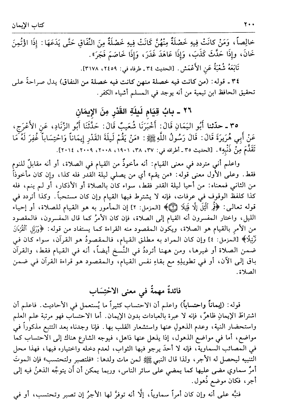 34 - قوله: (من كانت فيه خصلة منهن كانت فيه خصلة من النفاق) يدل صراحةً على تحقيق الحافظ ابن تيمية من أنه يوجد في المسلم أشياء الكفر.