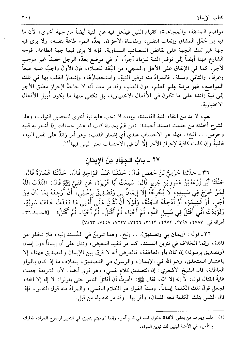 36 - قوله: (إيمان بي وتصديق) ... إلخ. وهذا تنوينٌ في المُسند إليه، فلا تخلو عن فائدة، وإنما الخلاف في تنوين المسند، كما مر فتفيد التبعيض، وتدل على أن إيمانًا دون إيمان (وتصديق برسوله) إن كان بأو العاطفة، فالغرض أنه لا فرق بين الإيمان والتصديق ههنا، إلا باعتبار المتعلق، وهو الله في الإيمان، والرسول في التصديق، بخلاف ما إذا كان بالواو العاطفة، قال الشيخ الأشعري: إن التصديق كلام نفسي، وهو قوي أيضًا. لأن الشريعة جعلت غايةَ القتال قول: لا إله إلا الله، فقال صلى الله عليه وسلّم «أمرتُ أن أقاتلَ الناسِ حتى يقولوا: لا إله إلا الله»، فجعل قولَ تلك الكلمة إيمانًا، ومبدأ القول هو الكلام النفسي، والمرادُ منه قول النفس، فإذا قال النفس بتلك الكلمة تبعه اللسان، وأقر بها. وقد مر تفصيله من قبل.