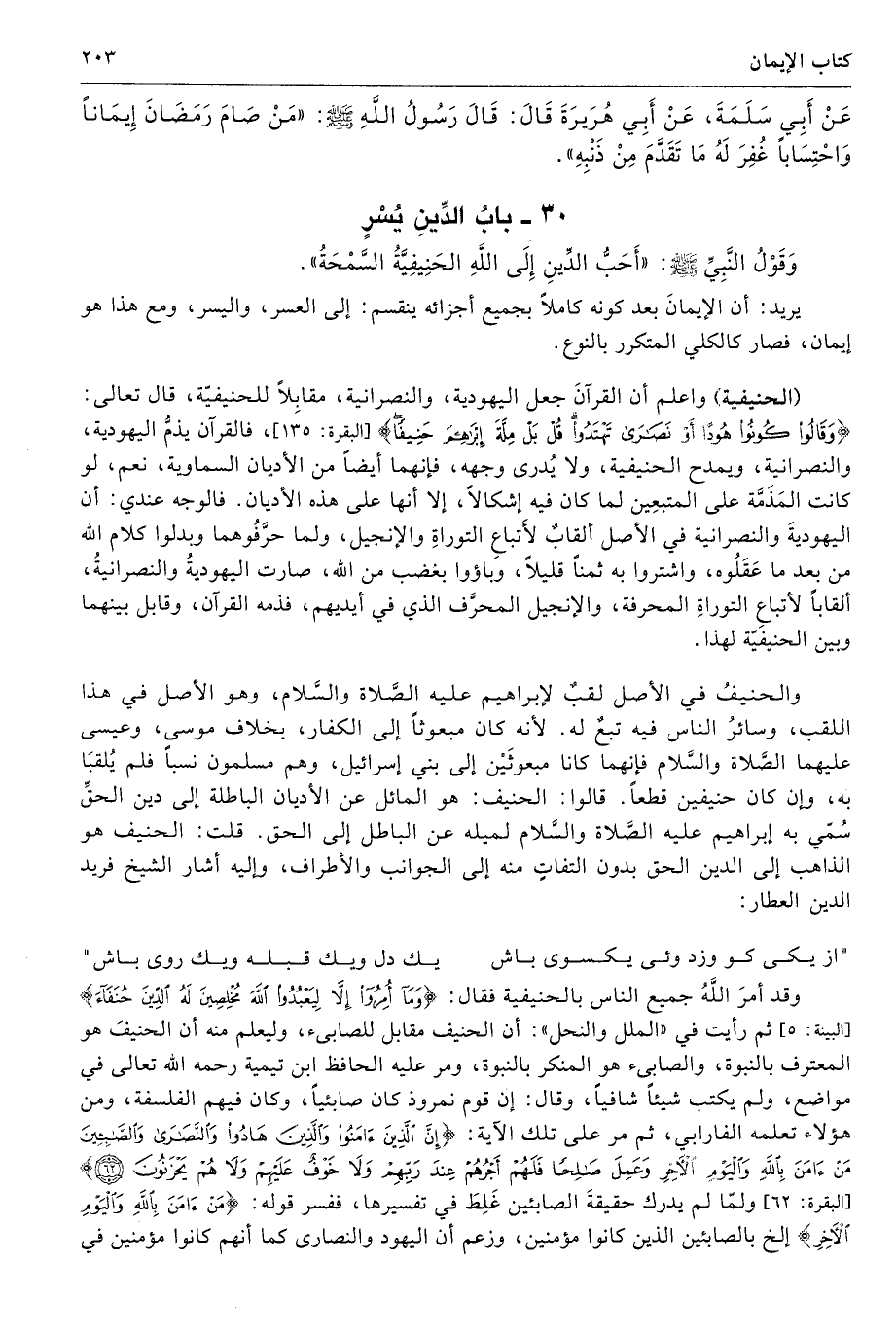 وقد أمرَ اللَّهُ جميع الناس بالحنيفية فقال: {وَمَا أُمِرُوا إِلَّا لِيَعْبُدُوا اللَّهَ مُخْلِصِينَ لَهُ الدِّينَ حُنَفَاءَ} [البينة: 5] ثم رأيت في «الملل والنحل»: أن الحنيف مقابل للصابيء، ويعلم منه أن الحنيفَ هو المعترف بالنبوة، والصابىء هو المنكر بالنبوة، ومر عليه الحافظ ابن تيمية رحمه الله تعالى في مواضع، ولم يكتب شيئًا شافيًا، وقال: إن قوم نمروذ كان صابئيًا، وكان فيهم الفلسفة، ومن هؤلاء تعلِّمه الفارابي، ثم مر على تلك الآية: {{إِنَّ الَّذِينَ آمَنُوا وَالَّذِينَ هَادُوا وَالنَّصَارَى وَالصَّابِئِينَ مَنْ آمَنَ بِاللَّهِ وَالْيَوْمِ الْآخِرِ وَعَمِلَ صَالِحًا فَلَهُمْ أَجْرُهُمْ عِنْدَ رَبِّهِمْ وَلَا خَوْفٌ عَلَيْهِمْ وَلَا هُمْ يَحْزَنُونَ (62)} [البقرة: 62] ولمّا لم يدرك حقيقةَ الصابئين غَلِطَ في تفسيرها، ففسر قوله: {مَنْ آمَنَ بِاللَّهِ وَالْيَوْمِ الْآخِرِ} إلخ بالصابئين الذين كانوا مؤمنين، وزعم أن اليهود والنصارى كما أنهم مؤمنين في