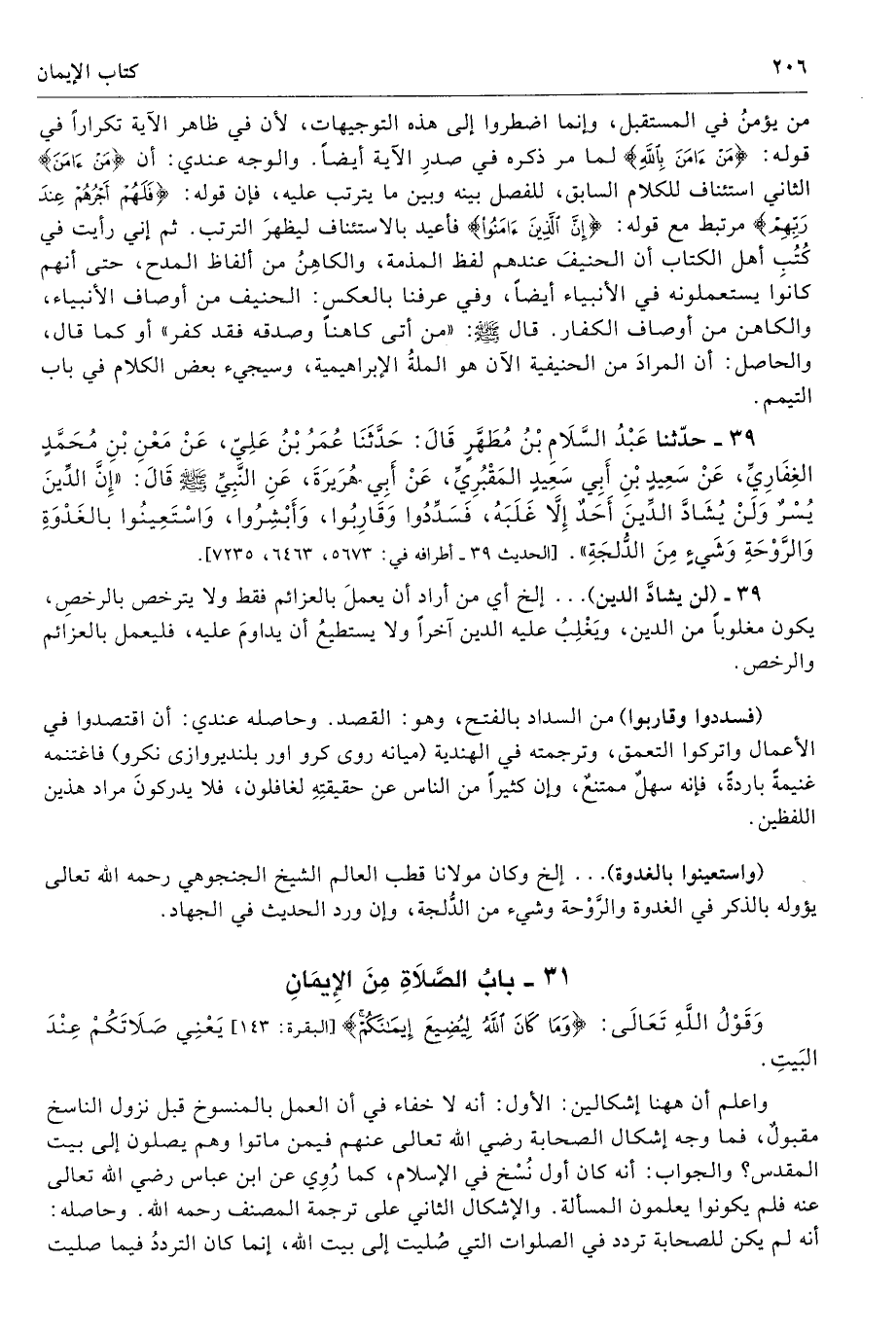 من يؤمنُ في المستقبل، وإنما اضطروا إلى هذه التوجيهات، لأن في ظاهر الآية تكرارًا في قوله: {مَنْ آمَنَ بِاللَّهِ} لما مر ذكره في صدرِ الآية أيضًا. والوجه عندي: أن {مَنْ آمَنَ} الثاني استئناف للكلام السابق، للفصل بينه وبين ما يترتب عليه، فإن قوله: {فلهم آجرهم عند ربهم} مرتبط مع قوله: {إِنَّ الَّذِينَ آمَنُواْ} فأعيد بالاستئناف ليظهرَ الترتب. ثم إني رأيت في كُتُبِ أهل الكتاب أن الحنيفَ عندهم لفظ المذمة، والكاهِنُ من ألفاظ المدح، حتى إنهم كانوا يستعملونه في الأنبياء أيضًا، وفي عرفنا بالعكس: الحنيف من أوصاف الأنبياء، والكاهن من أوصاف الكفار. قال صلى الله عليه وسلّم «من أتى كاهنًا وصدقه فقد كفر» أو كما قال، والحاصل: أن المرادَ من الحنيفية الآن هو الملةُ الإبراهيمية، وسيجيء بعض الكلام في باب التيمم.
