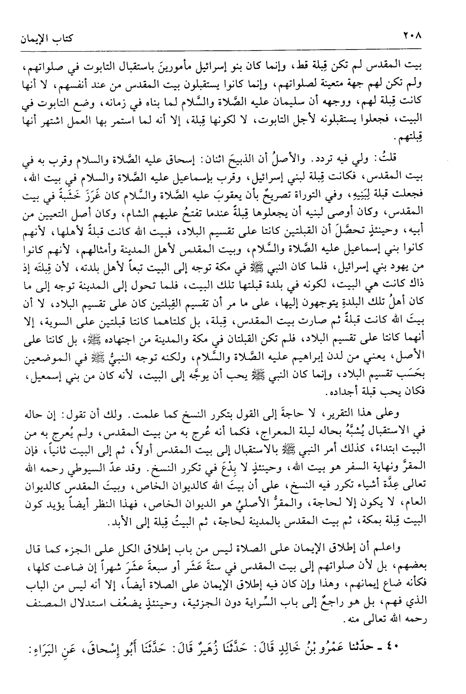 واعلم أن إطلاق الإيمان على الصلاة ليس من باب إطلاق الكل على الجزء كما قال بعضهم، بل لأن صلواتهم إلى بيت المقدس في ستةَ عَشَر أو سبعةَ عشَرَ شهرًا إن ضاعت كلها، فكأنه ضاع إيمانهم، وهذا وإن كان فيه إطلاق الإيمان على الصلاة أيضًا، إلا أنه ليس من الباب الذي فهم، بل هو راجعٌ إلى باب السِّراية دون الجزئية، وحينئذٍ يضعُف استدلال المصنف رحمه الله تعالى منه.