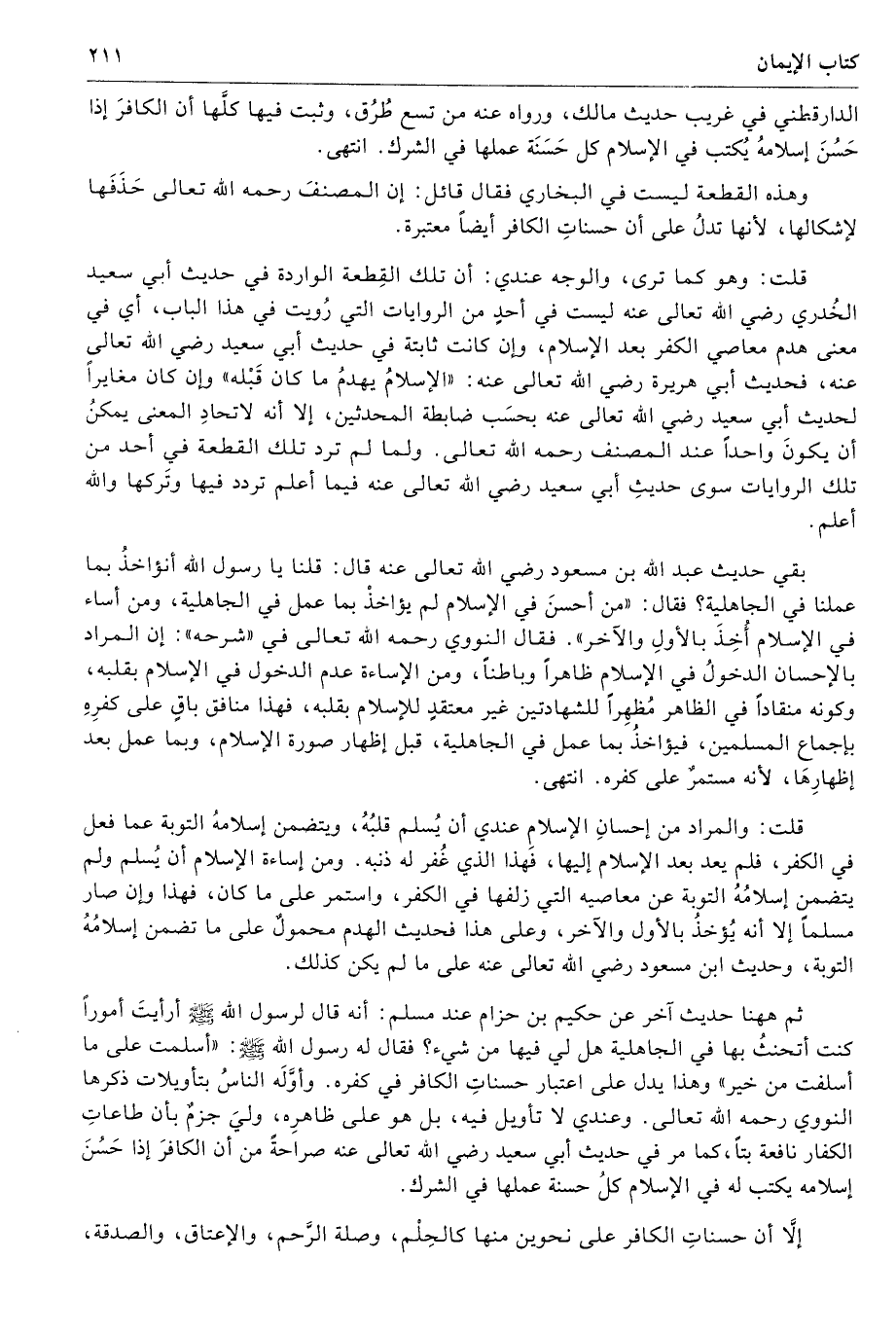 ثم ههنا حديث آخر عن حكيم بن حزام عند مسلم: أنه قال لرسول الله صلى الله عليه وسلّم أرأيتَ أمورًا كنت أتحنثُ بها في الجاهلية هل لي فيها من شيء؟ فقال له رسول الله صلى الله عليه وسلّم «أسلمت على ما أسلفت من خير» وهذا يدل على اعتبار حسناتِ الكافر في كفره. وأوَّلَه الناسُ بتأويلات ذكرها النووي رحمه الله تعالى. وعندي لا تأويل فيه، بل هو على ظاهرِه، وليَ جزمٌ بأن طاعاتِ الكفار نافعة بتًا، كما مر في حديث أبي سعيد رضي الله تعالى عنه صراحةً من أن الكافرَ إذا حَسُنَ إسلامه يكتب له في الإسلام كلُ حسنة عملِها في الشرك.