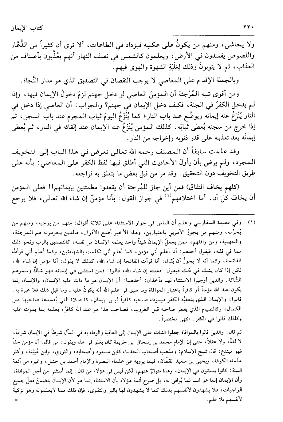 (¬1) وفي عقيدة السفاريني واعلم أن الناس في جواز الاستثناء على ثلاثة أقوال: منهم من يوجبه، ومنهم من يُحرِّمه، ومنهم من يجوزُ الأمرينِ باعتبارين، وهذا الأخير أصح الأقوال، فالذين يحرمونه هم المرجئة، والجهمية، ومن وافقهم، ممن يجعلُ الإيمانَ شيئًا واحد يعلمه الإنسان من نفسه، كالتصديق بالرب ونحو ذلك مما في قلبه، فيقول أحدهم: أنا أعلم أني مؤمن، كما أعلم أني تكلمت بالشهادتين، وكما أعلم أني قرأتُ الفاتحة، وكما أنه لا يجوزُ أن يُقال: أنا قرأت الفاتحة إن شاء الله، كذلك لا يقول: أنا مؤمن إن شاء الله، لكن إذا كان يشك في ذلك فيقول: فعلته إن شاء الله، قالوا: فمن استثنى في إيمانه فهو شاكُّ وسموهم الشَّاكة. والذين أوجبوا الاستثناء لهم مأخذان: أحدهما: أن الإيمان هو ما مات عليه الإنسان، والإنسان إنما يكون عند الله مؤمنًا أو كافرًا باعتبار الموافاة وما سبق في علم الله أنه يكونُ عليه - وما قبل ذلك فلا عبرة به.