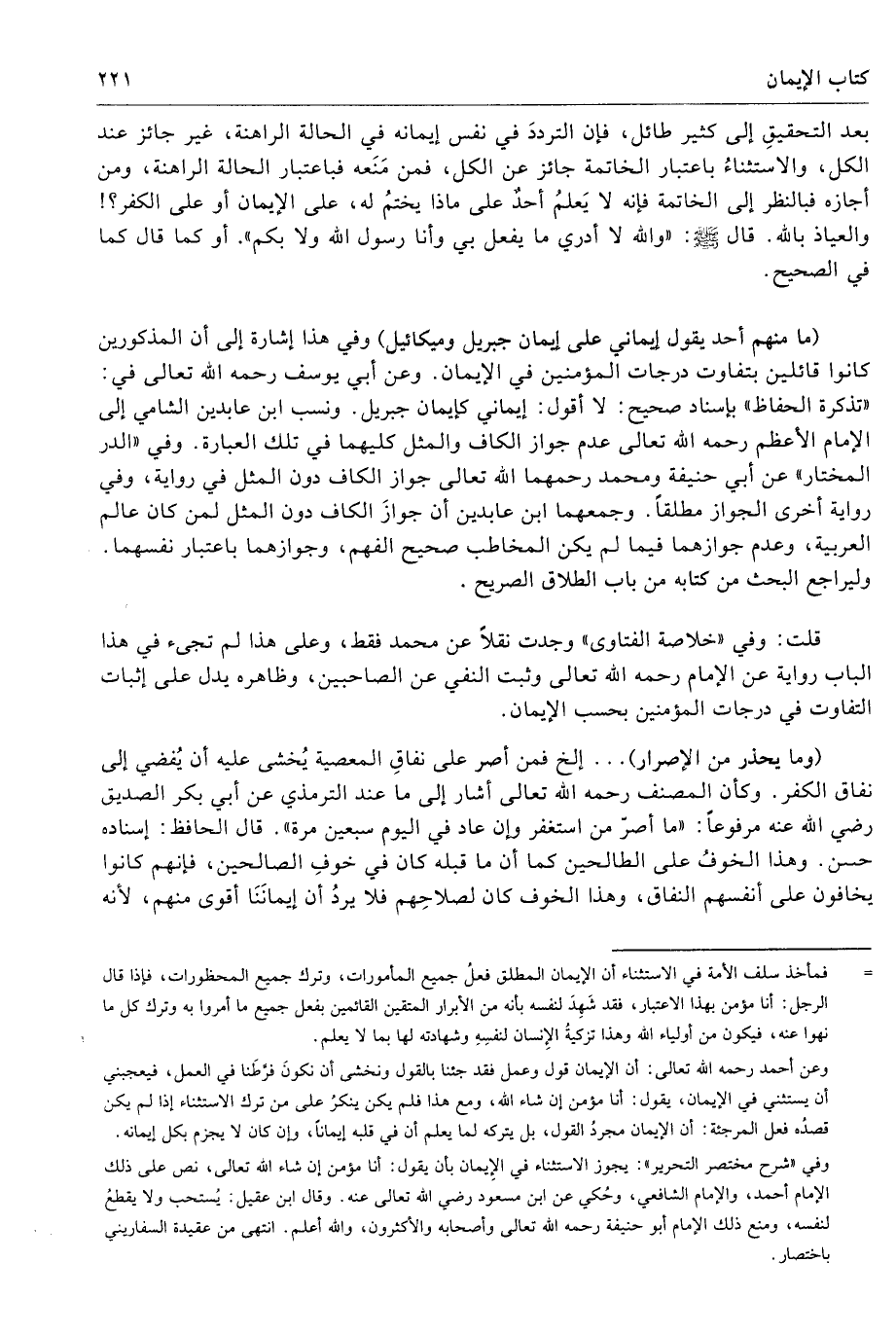 (ما منهم أحد يقول إيماني على إيمان جبريل وميكائيل) وفي هذا إشارة إلى أن المذكورين كانوا قائلين بتفاوت درجات المؤمنين في الإيمان. وعن أبي يوسف رحمه الله تعالى في: «تذكرة الحفاظ» بإسناد صحيح: لا أقول: إيماني كإيمان جبريل. ونسب ابن عابدين الشامي إلى الإمام الأعظم رحمه الله تعالى عدم جواز الكاف والمثل كليهما في تلك العبارة. وفي «الدر المختار» عن أبي حنيفة ومحمد رحمهما الله تعالى جواز الكاف دون المثل في رواية، وفي رواية أخرى الجواز مطلقًا. وجمعهما ابن عابدين أن جوازَ الكاف دون المثل لمن كان عالم العربية، وعدم جوازهما فيما لم يكن المخاطب صحيح الفهم، وجوازهما باعتبار نفسهما. وليراجع البحث من كتابه من باب الطلاق الصريح.