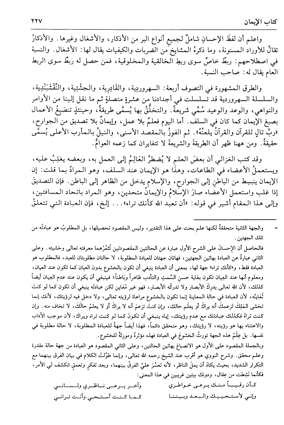 وقد كتب الغزالي أن بعضَ العلمِ لا يُضطرُ العَالِمُ إلى العمل به، وبعضه يغلِبُ عليه، ويستعملُ الأعضاء في الطاعات، وهذا هو الإيمان عند السلف، وهو المرادُ بما قلت: إن الإيمان ينبسِط من الباطنِ إلى الجوارحِ، والإسلام يدخل من الظاهر إلى الباطن. فإن التصديقَ إذا غلب واستعمل الأعضاء صارَ الإسلامُ والإيمانُ متحدين، وهو المراد باتحاد المسافتين، وإلى هذا المقام أشير في قوله: «أن تعبد الله كأنك تراه» ... إلخ، فإن العبادة التي تتعلقُ