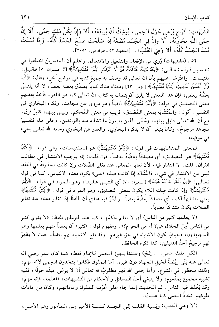 الشُّبُهَاتِ كَرَاعٍ يَرْعَى حَوْلَ الْحِمَى، يُوشِكُ أَنْ يُوَاقِعَهُ. أَلاَ وَإِنَّ لِكُلِّ مَلِكٍ حِمًى، أَلاَ إِنَّ حِمَى اللَّهِ فِى أَرْضِهِ مَحَارِمُهُ، أَلاَ وَإِنَّ فِى الْجَسَدِ مُضْغَةً إِذَا صَلَحَتْ صَلَحَ الْجَسَدُ كُلُّهُ، وَإِذَا فَسَدَتْ فَسَدَ الْجَسَدُ كُلُّهُ. أَلاَ وَهِىَ الْقَلْبُ». طرفه 2051 - تحفة 11624