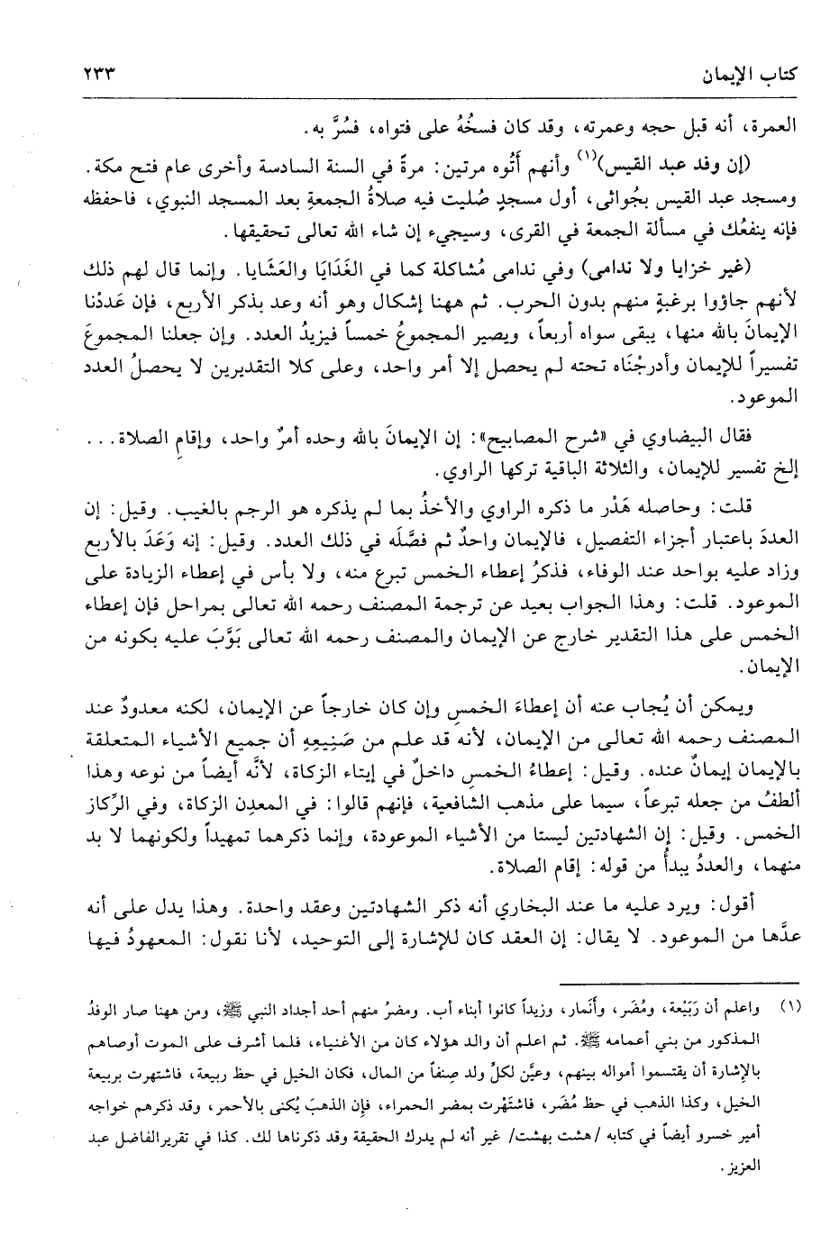 ويمكن أن يُجاب عنه أن إعطاءَ الخمسِ وإن كان خارجًا عن الإيمان، لكنه معدودٌ عند المصنف رحمه الله تعالى من الإيمان، لأنه قد علم من صَنِيْعِهِ أن جميع الأشياء المتعلقة بالإيمان إيمانٌ عنده. وقيل: إعطاءُ الخمسِ داخلٌ في إيتاء الزكاة، لأنَّه أيضًا من نوعه وهذا ألطفُ من جعله تبرعًا، سيما على مذهب الشافعية، فإنهم قالوا: في المعدِن الزكاة، وفي الرِّكاز الخمس. وقيل: إن الشهادتين ليستا من الأشياء الموعودة، وإنما ذكرهما تمهيدًا ولكونهما لا بد منهما، والعددُ يبدأُ من قوله: إقام الصلاة.