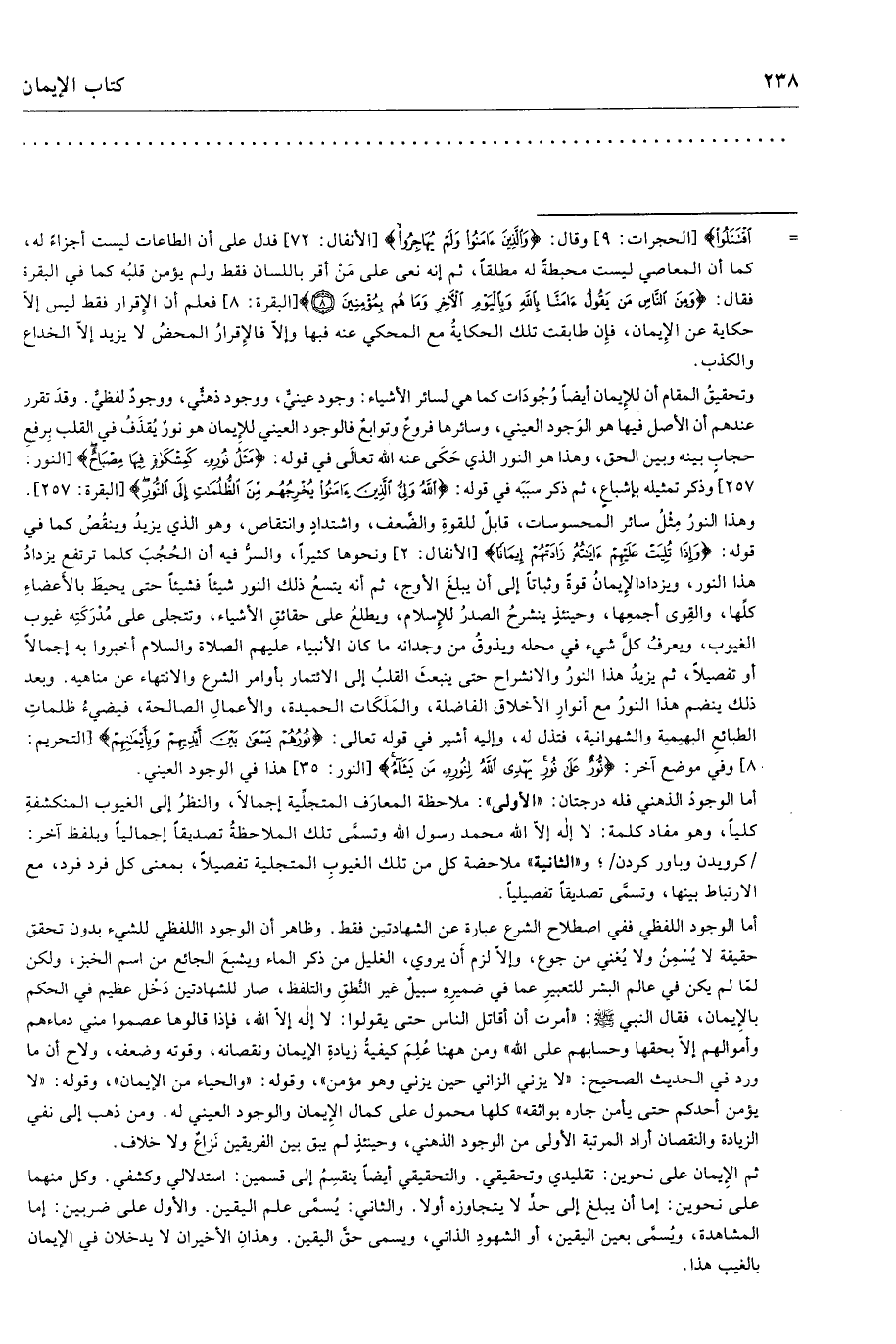 وتحقيقُ المقام أن للإِيمان أيضًا وُجُودَات كما هي لسائر الأشياء: وجود عينيٌّ، ووجود ذهني، ووجودٌ لفظيٌّ. وقدَ تقرر عندهم أن الأصل فيها هو الوَجود العيني، وسائرها فروعٌ وتوابعٌ فالوجود العيني للإِيمان هو نورٌ يُقذَفُ في القلب بِرفعِ حجاب بينه وبين الحق، وهذا هو النور الذي حَكَى عنه الله تعالَى في قوله: {مَثَلُ نُورِهِ كَمِشْكَاةٍ فِيهَا مِصْبَاحٌ} [النور: 35] وذكر تمثيله بإشباعٍ، ثم ذكر سبَبَه في قوله: {اللَّهُ وَلِيُّ الَّذِينَ آمَنُوا يُخْرِجُهُمْ مِنَ الظُّلُمَاتِ إِلَى النُّورِ} [البقرة: 257].