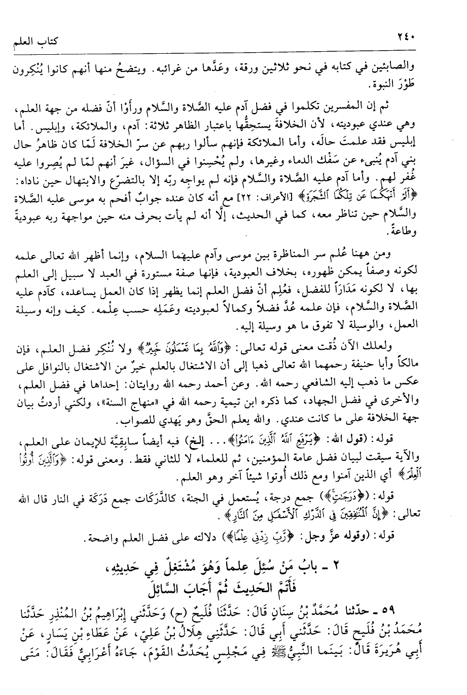 قوله: (قول الله: {يَرْفَعِ اللَّهُ الَّذِينَ ءامَنُواْ} ... إلخ) فيه أيضًا سابِقِيَّة للإيمان على العلم، والآية سيقت لبيان فضل عامة المؤمنين، ثم للعلماء لا للثاني فقط. ومعنى قوله: {وَالَّذِينَ أُوتُواْ الْعِلْمَ} أي الذين آمنوا ومع ذلك أُوتوا شيئًا آخر وهو العلم.