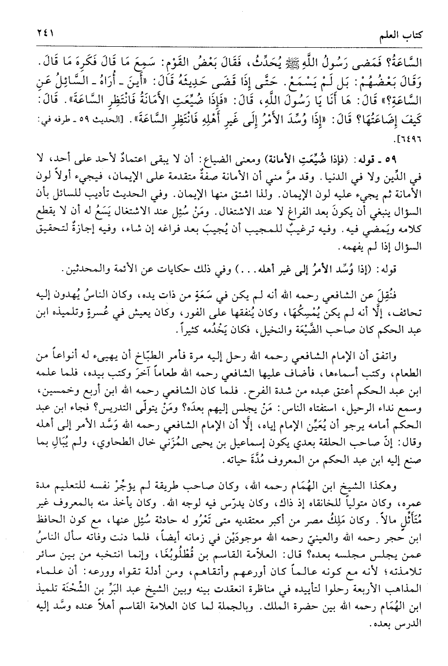59 - قوله: (فإذا ضُيِّعَتِ الأمانة) ومعنى الضياع: أن لا يبقى اعتمادٌ لأحد على أحد، لا في الدِّين ولا في الدنيا. وقد مرَّ مني أن الأمانة صفةٌ متقدمة على الإيمان، فيجيء أولًا لون الأمانة ثم يجيء عليه لون الإيمان. ولذا اشتق منها الإيمان. وفي الحديث تأديب للسائل بأن السؤال ينبغي أن يكونَ بعد الفراغ لا عند الاشتغال. ومَنْ سُئِل عند الاشتغال يَسَعُ له أن لا يقطع كلامه ويَمضي فيه. وفيه ترغيبٌ للمجيب أن يُجيبَ بعد فراغه إن شاء، وفيه إجازةٌ لتحقيق السؤال إذا لم يفهمه.