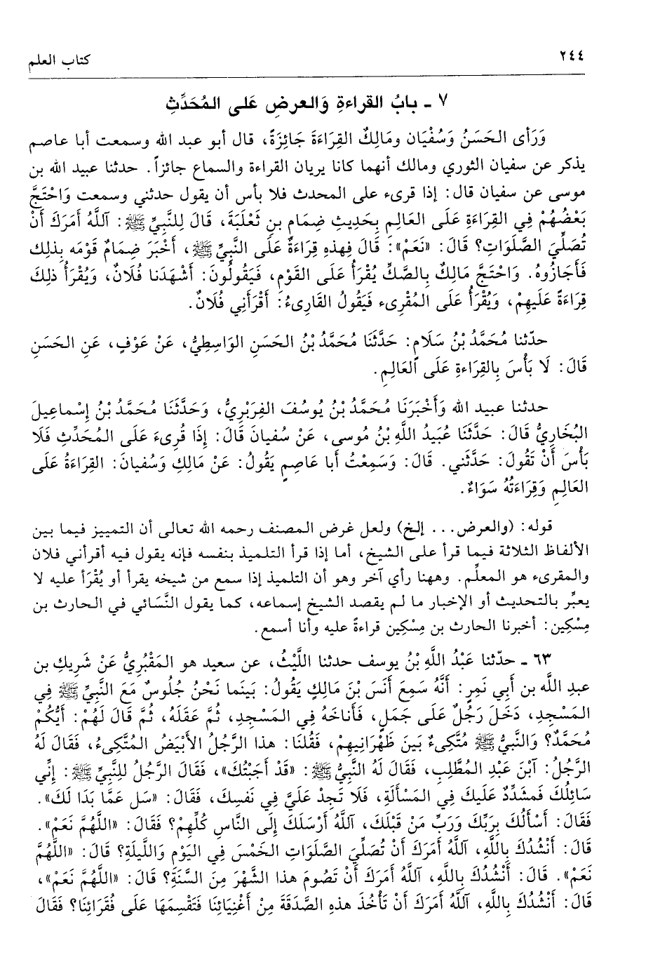 وَرَأَى الْحَسَنُ وَالثَّوْرِىُّ وَمَالِكٌ الْقِرَاءَةَ جَائِزَةً، وَاحْتَجَّ بَعْضُهُمْ فِى الْقِرَاءَةِ عَلَى الْعَالِمِ بِحَدِيثِ ضِمَامِ بْنِ ثَعْلَبَةَ قَالَ لِلنَّبِىِّ - صلى الله عليه وسلم - آللَّهُ أَمَرَكَ أَنْ نُصَلِّىَ الصَّلَوَاتِ قَالَ «نَعَمْ». قَالَ فَهَذِهِ قِرَاءَةٌ عَلَى النَّبِىِّ - صلى الله عليه وسلم - أَخْبَرَ ضِمَامٌ قَوْمَهُ بِذَلِكَ فَأَجَازُوهُ. وَاحْتَجَّ مَالِكٌ بِالصَّكِّ يُقْرَأُ عَلَى الْقَوْمِ فَيَقُولُونَ أَشْهَدَنَا فُلاَنٌ. وَيُقْرَأُ ذَلِكَ قِرَاءَةً عَلَيْهِمْ، وَيُقْرَأُ عَلَى الْمُقْرِئِ فَيَقُولُ الْقَارِئُ أَقْرَأَنِى فُلاَنٌ.