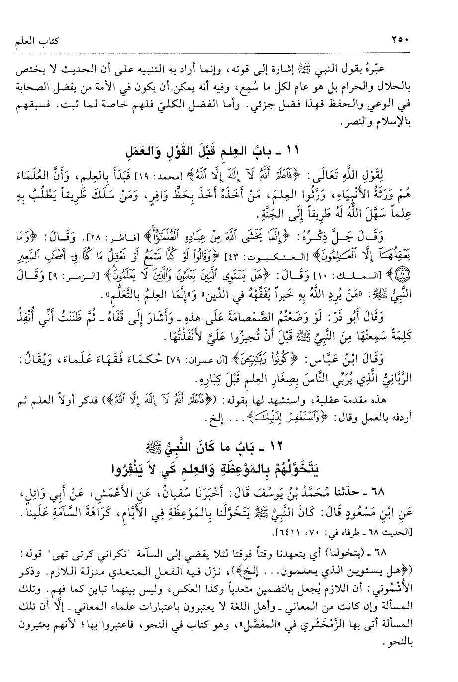 68 - حَدَّثَنَا مُحَمَّدُ بْنُ يُوسُفَ قَالَ أَخْبَرَنَا سُفْيَانُ عَنِ الأَعْمَشِ عَنْ أَبِى وَائِلٍ عَنِ ابْنِ مَسْعُودٍ قَالَ كَانَ النَّبِىُّ - صلى الله عليه وسلم - يَتَخَوَّلُنَا بِالْمَوْعِظَةِ فِى الأَيَّامِ، كَرَاهَةَ السَّآمَةِ عَلَيْنَا. طرفاه 70، 6411 - تحفة 9254