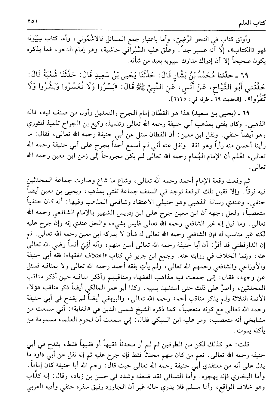 69 - (يحيى بن سعيد) هذا هو القطَّان إمام الجرح والتعديل وأول من صنف فيه، قاله الذهبي. وكان يفتي بمذهب أبي حنيفة رحمه الله تعالى وتلميذه وكيع بن الجراح تلميذ للثوري وهو أيضًا حنفي. ونقل ابن معين: أن القطان سئل عن أبي حنيفة رحمه الله تعالى، فقال: ما رأينا أحسن منه رأيًا وهو ثقة. ونقل عنه أني لم أسمع أحدًا يجرح على أبي حنيفة رحمه الله تعالى، فعُلم أن الإمام الهُمام رحمه الله تعالى لم يكن مجروحًا إلى زمن ابن معين رحمه الله تعالى.